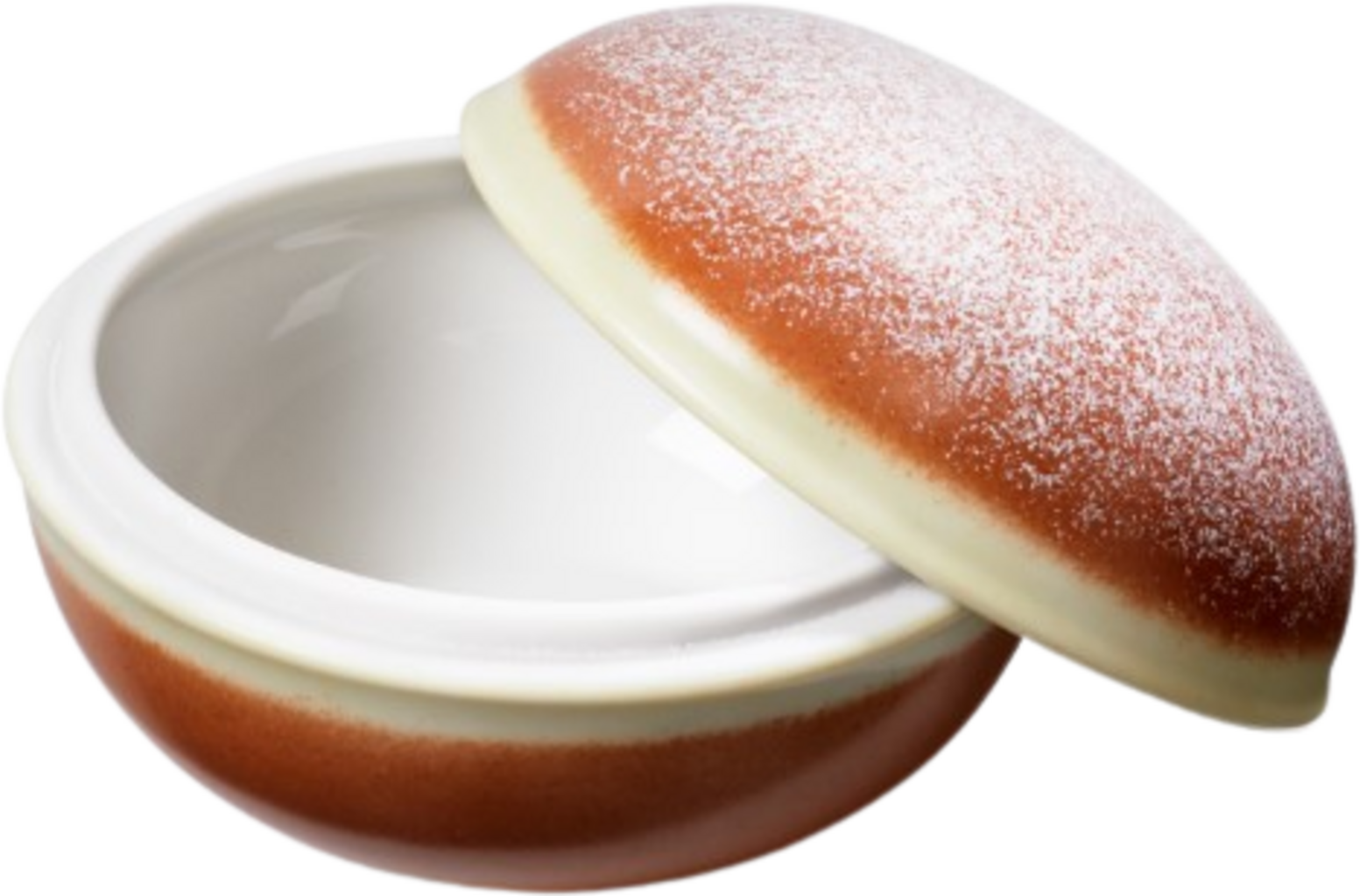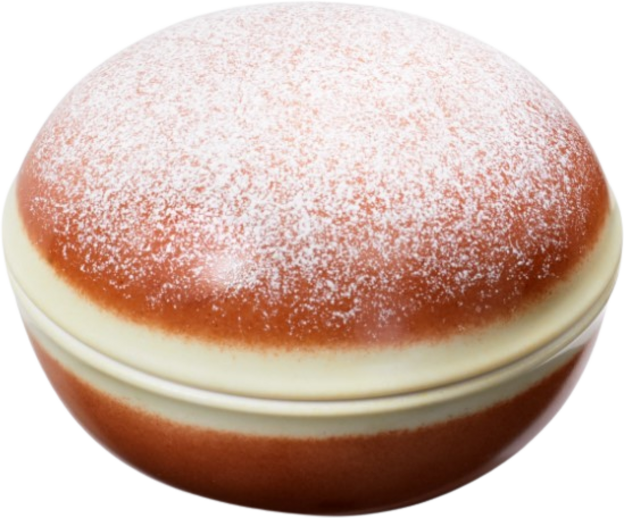La caja en forma de krapfen de la manufactura Augarten es un original homenaje al tradicional pastel de carnaval austriaco. Guarda un asombroso parecido con el famoso brioche relleno de mermelada de albaricoque, aportando simpatía y calidez a la cocina o a la mesa. Fabricado en porcelana fina, es ideal como objeto decorativo o para guardar mantequilla, mermelada y pequeñas delicias.