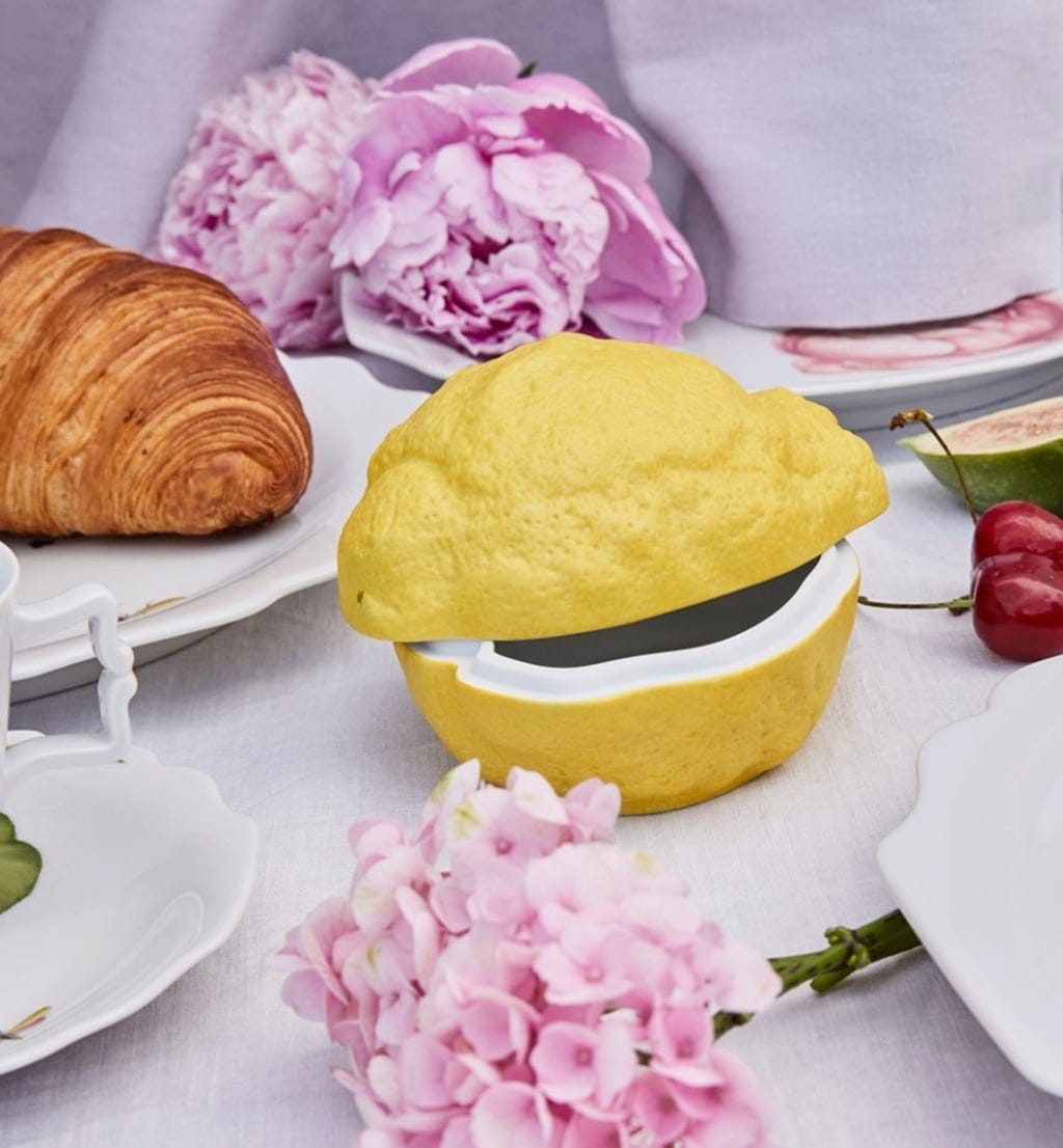 Esta extraordinaria caja con forma de limón forma parte de la colección Home, desarrollada a lo largo de varios años junto con el famoso diseñador Giambattista Valli y la manufactura Augarten.