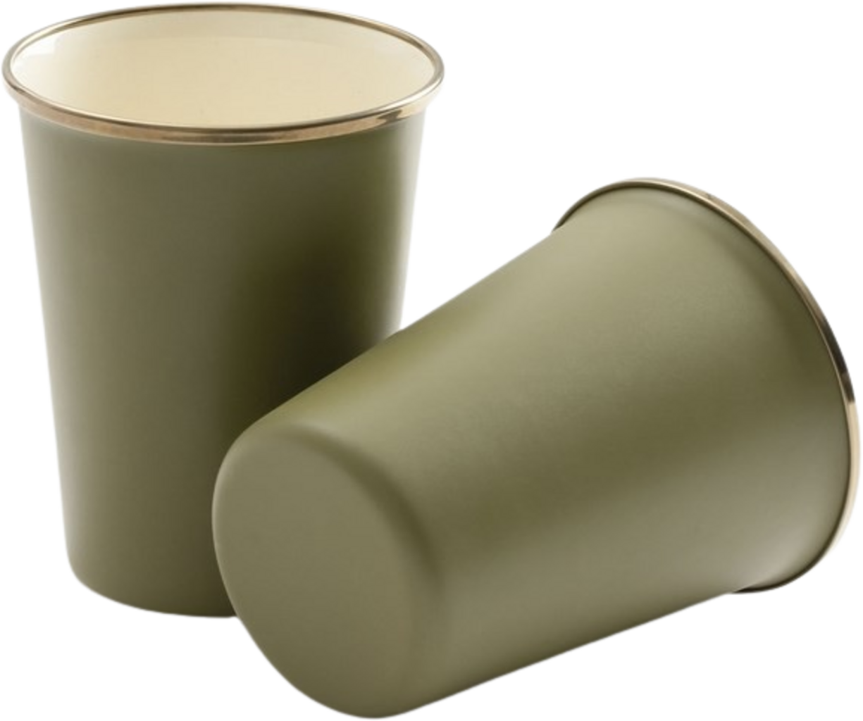 Estos vasos esmaltados son adecuados para su uso tanto en exteriores como en la cocina y son un elemento elegante para cualquier ocasión. Cada vaso tiene un borde de acero inoxidable, cuidadosamente acabado a mano para crear una pátina única que recuerda al bronce. Fabricados en acero inoxidable de alta calidad, con una capa base de esmalte y dos capas más de acabado, estos vasos garantizan una calidad y durabilidad excepcionales, por lo que son perfectos para el uso diario.