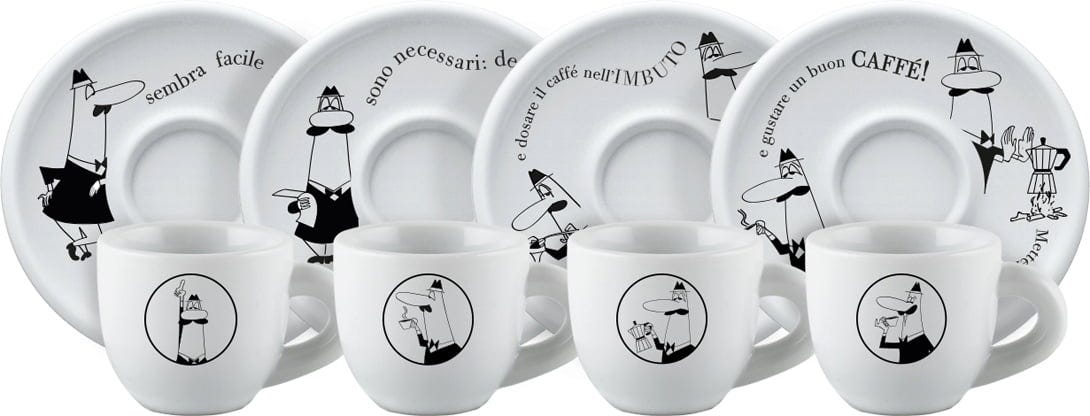 Las tazas y los platitos de este juego están decorados con el icónico hombrecillo de Bialetti y la historia de la preparación del café con la Moka Express.