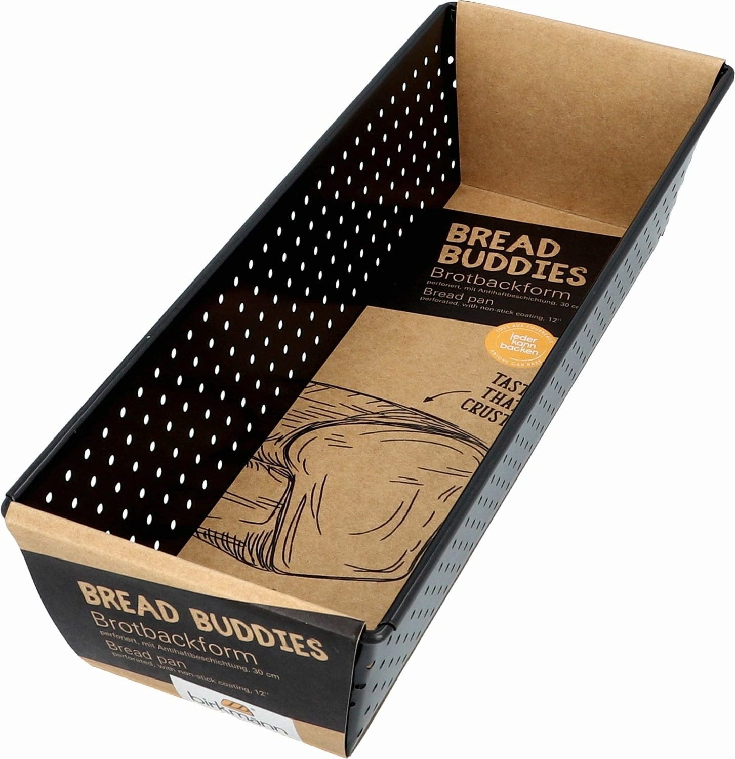 La innovadora bandeja para pan de molde de la línea Bread Buddies de Birkmann, con superficie perforada, permite que cualquier persona hornee pan fresco en casa. El revestimiento antiadherente de alta calidad evita que la masa se pegue.