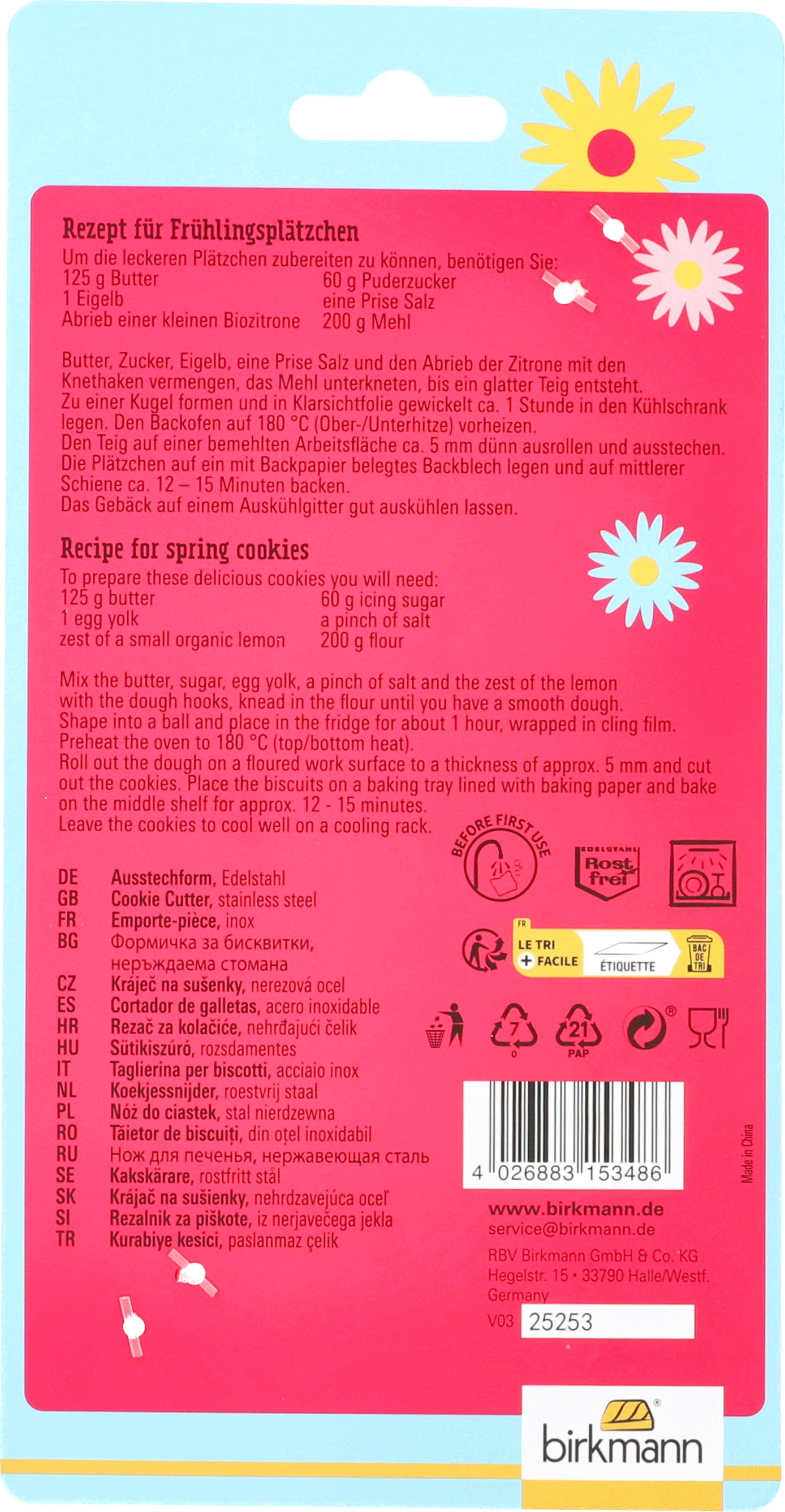 Con este molde para galletas XXL de Pascua de Birkmann, ¡crearás un ambiente festivo en tu mesa de café en un abrir y cerrar de ojos! El acero inoxidable de alta calidad, resistente al óxido, se desliza fácilmente por la masa y, gracias a su preciso acabado, garantiza bordes nítidos y limpios, para que tu dulce conejito de Pascua mantenga una forma impecable.
