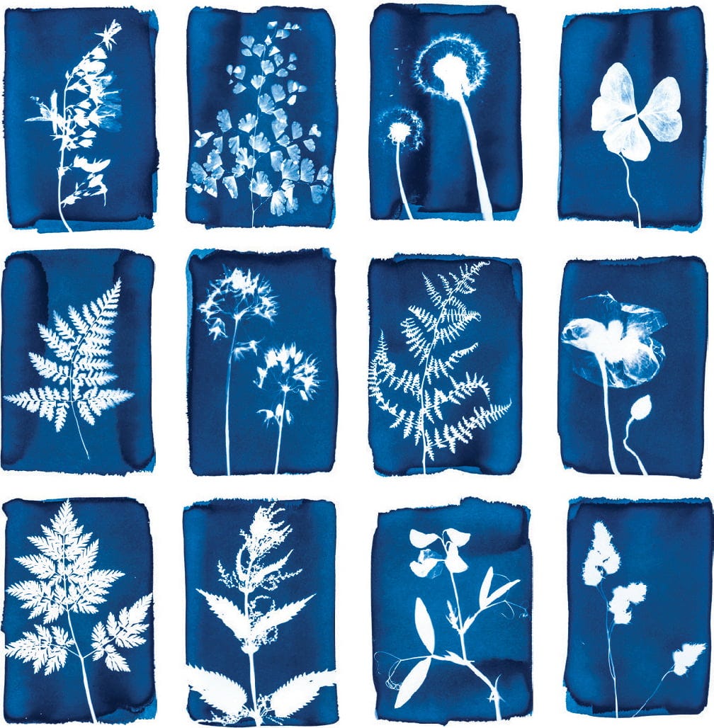 Las decoraciones botánicas de este set de 12 tarjetas de felicitación fueron obtenidas con la técnica de cianotipia. Plegables y con suficiente espacio para escribir lo que desees, las tarjetas también son una excelente decoración para la pared.