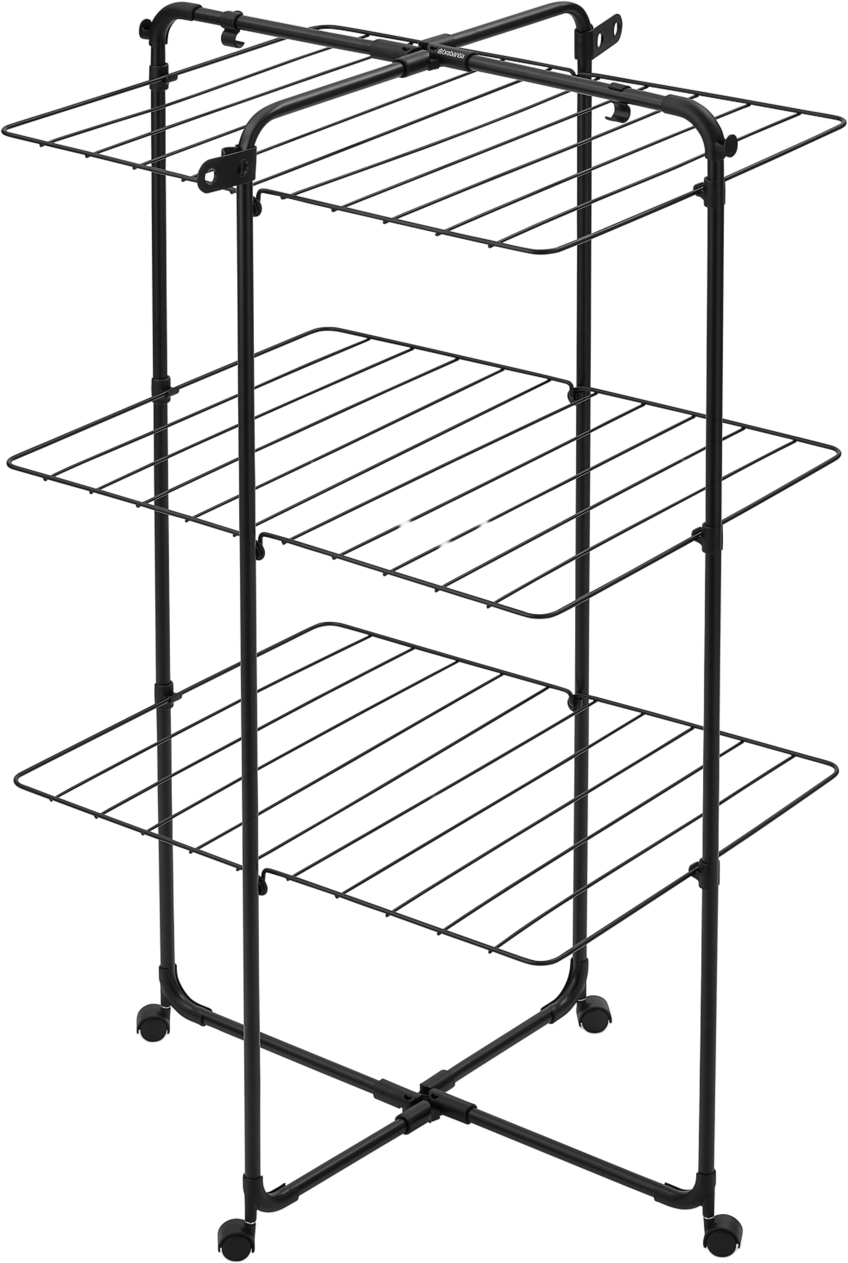 El tendedero vertical HangOn de 23 metros de longitud es perfecto para secar grandes cantidades de ropa ahorrando espacio. Los tres estantes plegables ofrecen espacio suficiente para prendas pequeñas y grandes, desde camisas hasta toallas. Gracias a sus cuatro ruedas, el tendedero puede girarse fácilmente y desplazarse a cualquier rincón.