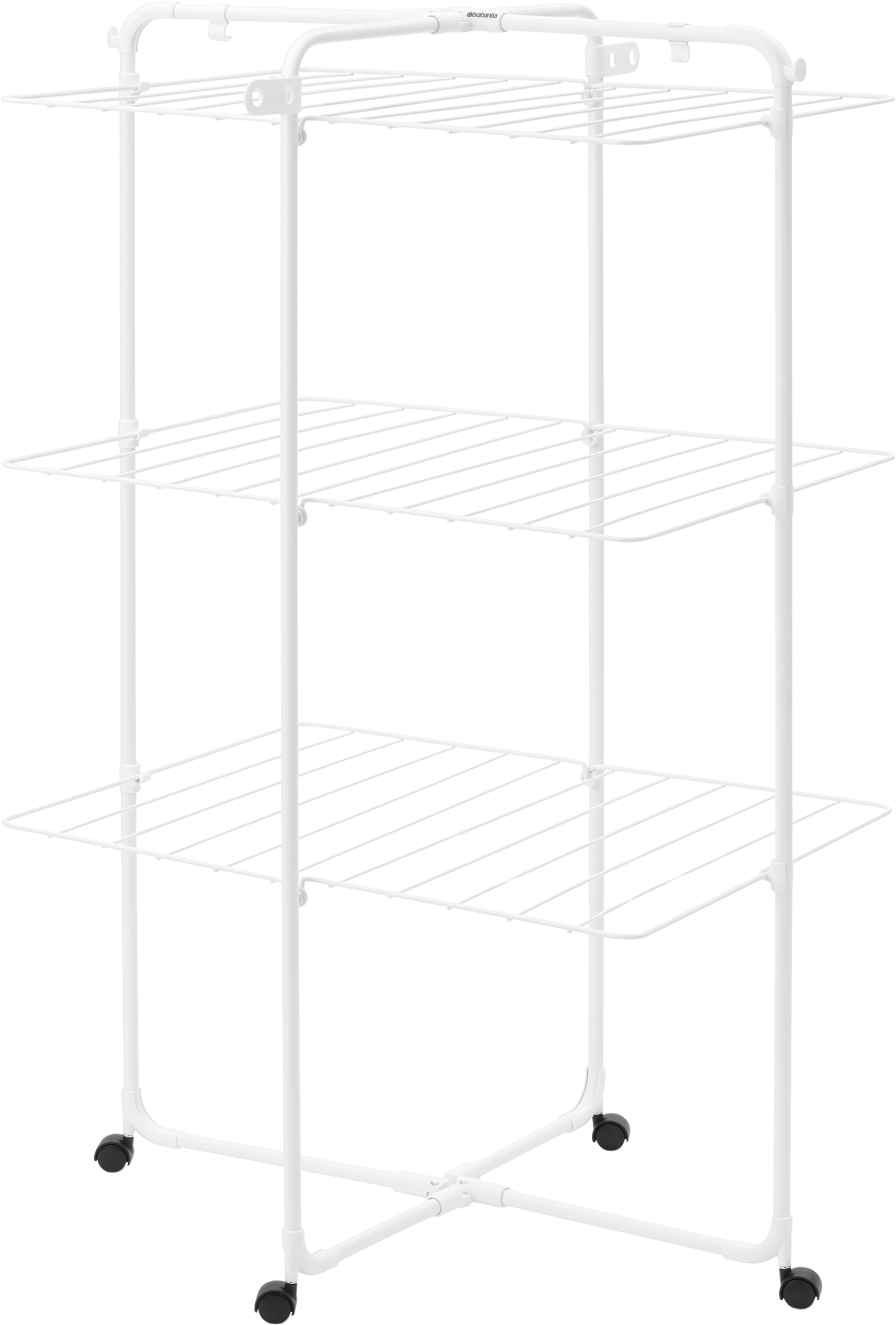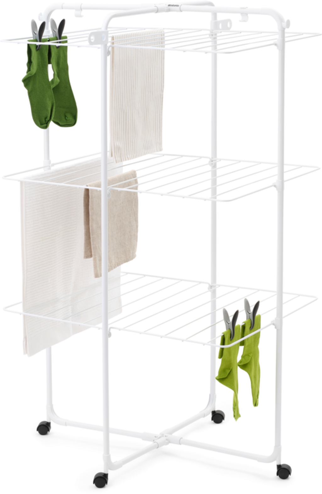 El tendedero vertical HangOn de 23 metros de longitud es perfecto para secar grandes cantidades de ropa ahorrando espacio. Los tres estantes plegables ofrecen espacio suficiente para prendas pequeñas y grandes, desde camisas hasta toallas. Gracias a sus cuatro ruedas, el tendedero puede girarse fácilmente y desplazarse a cualquier rincón.