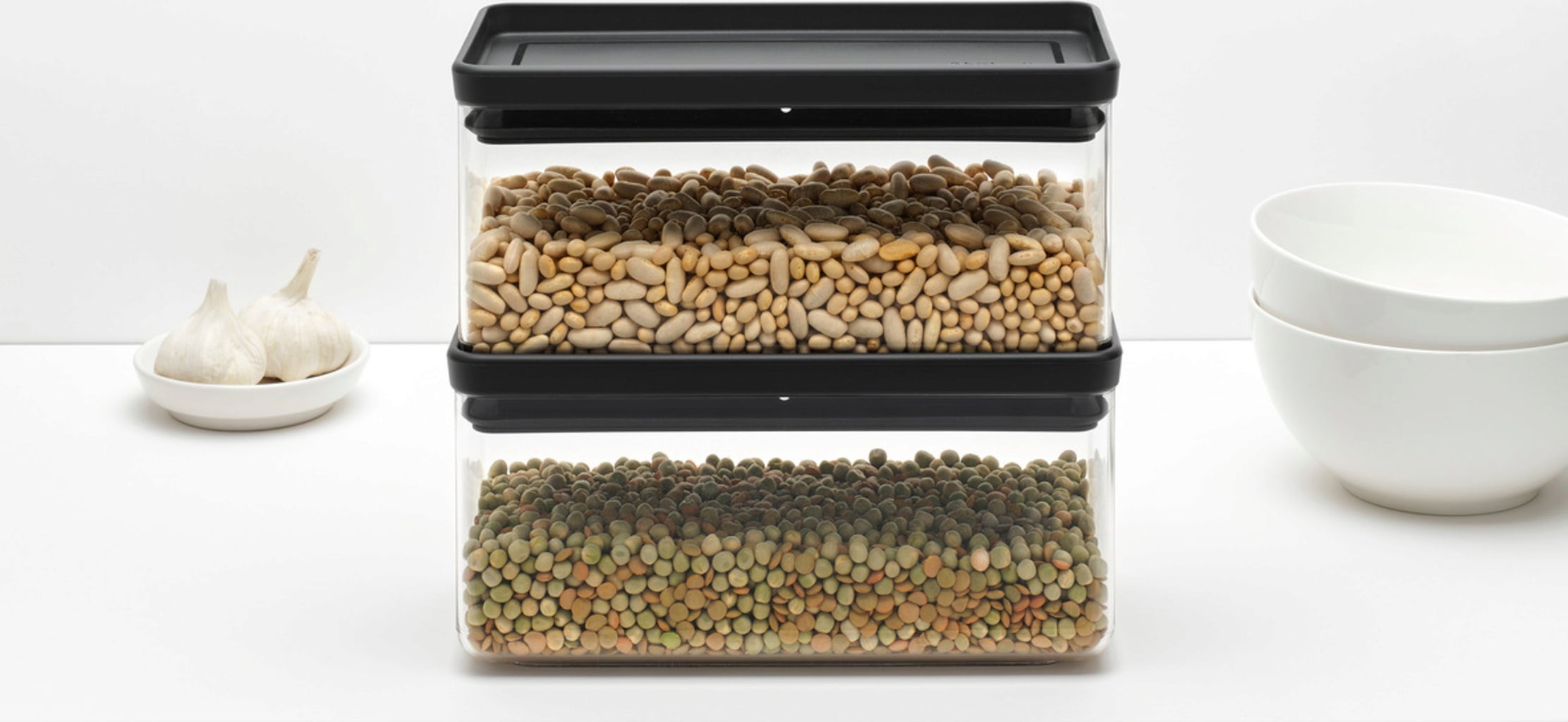 Los recipientes de plástico transparente de la serie Tasty+ de Brabantia te permiten mantener ordenada la despensa, al tiempo que aportan un toque de elegancia. Los botes están disponibles en distintos tamaños y se pueden apilar para ahorrar espacio. Como son transparentes, puedes ver fácilmente lo que contiene cada bote, mientras que la tapa con cierre de silicona mantiene los alimentos frescos durante mucho tiempo.