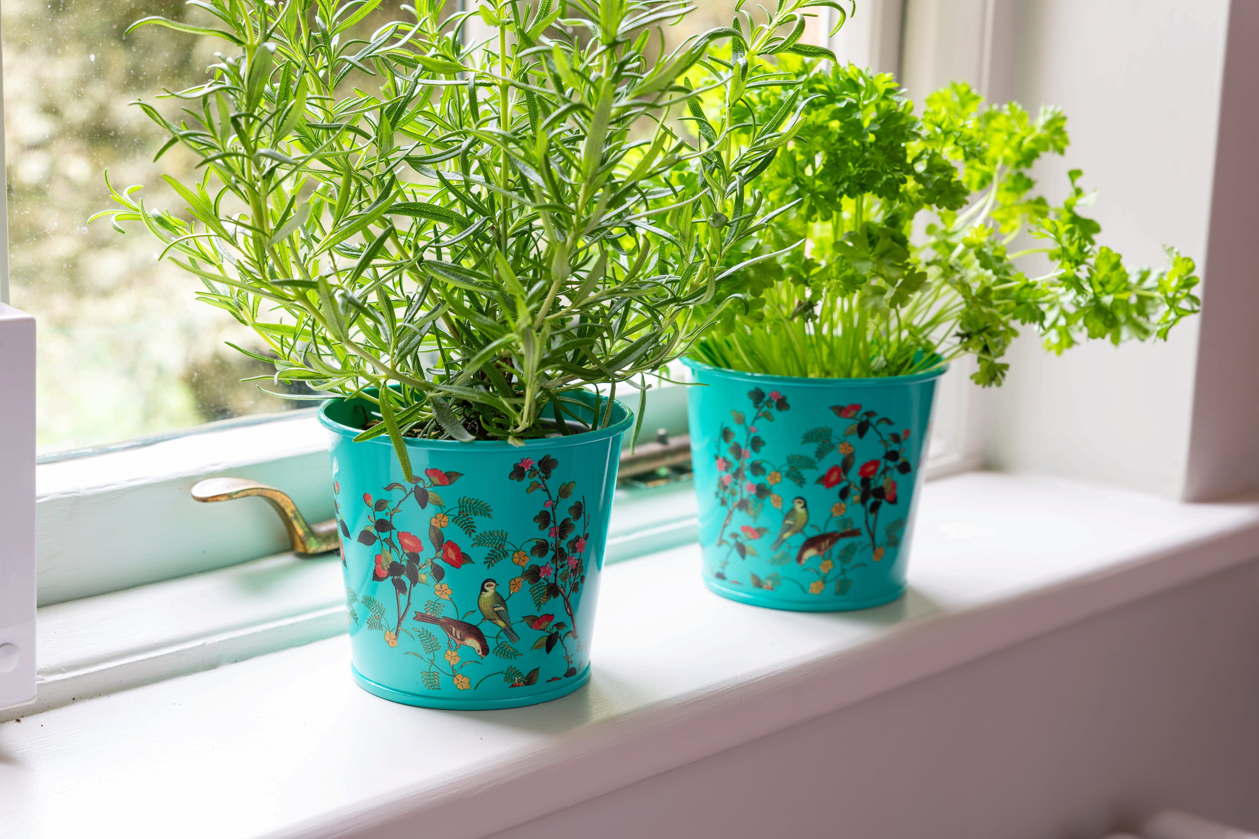 Las elegantes macetas para hierbas aromáticas de Burgon & Ball aportan un aire de jardín inglés a la ventana. Fabricadas en acero con un resistente recubrimiento en polvo, están decoradas con el refinado diseño Flora & Fauna, enriquecido con ilustraciones históricas de aves y motivos botánicos procedentes de los archivos de la RHS.