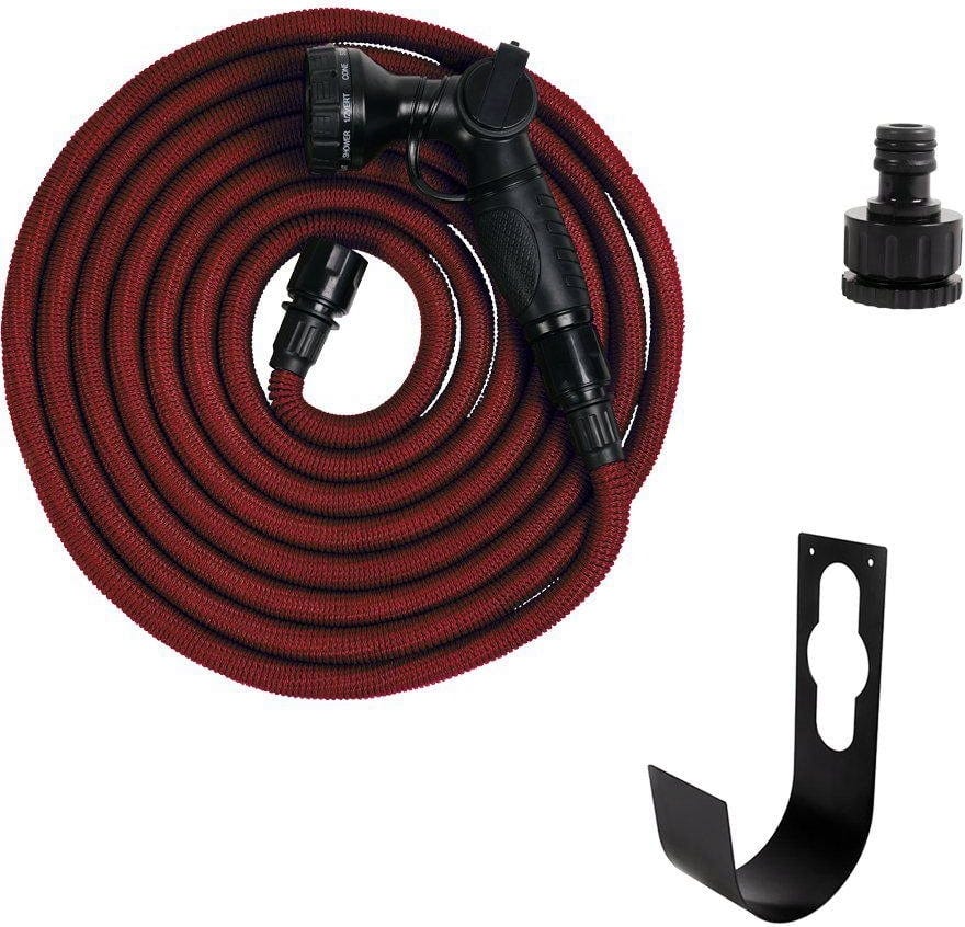 - Manguera de jardín Deluxe: Esta manguera de 15 m de longitud, fabricada con tejido duradero en el exterior y látex natural en el interior, se expande con el agua.