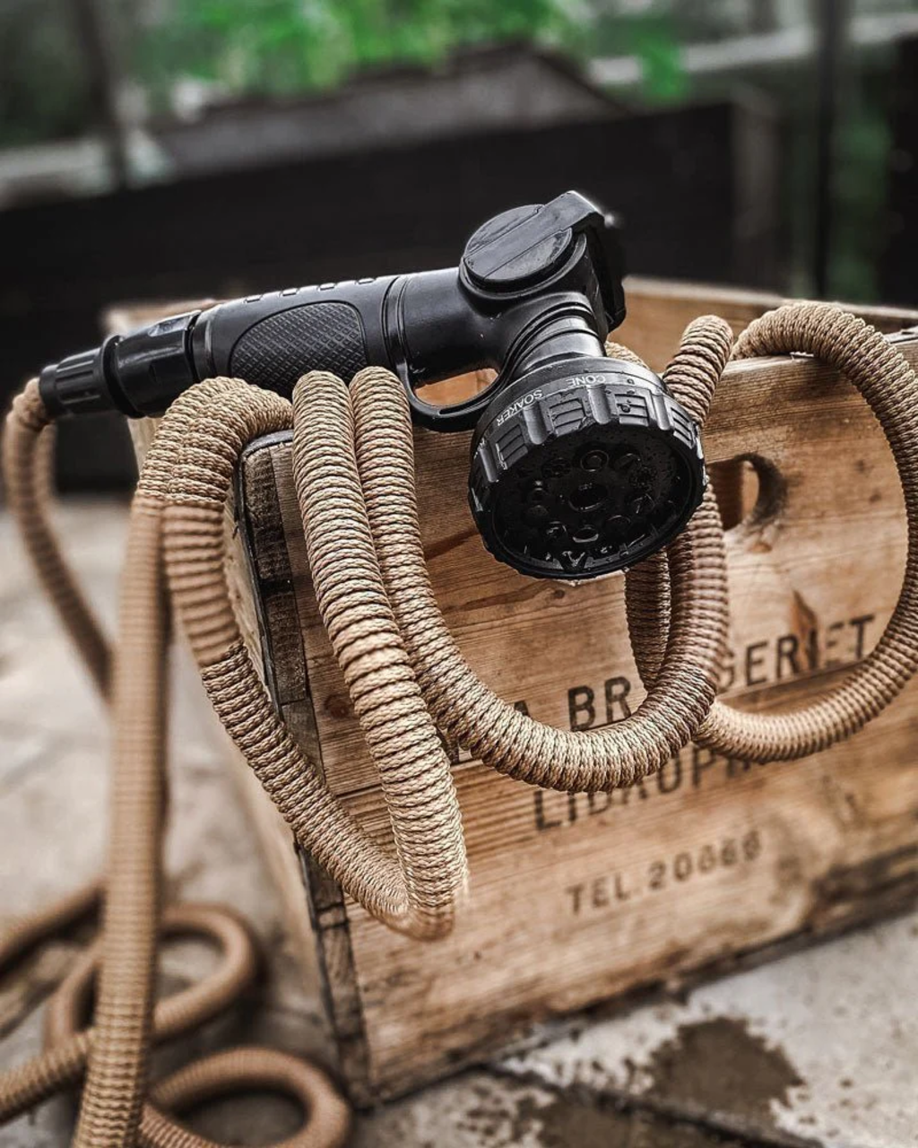 Manguera de jardín Deluxe: esta manguera de 25 m de longitud, fabricada con tejido duradero en el exterior y látex natural en el interior, se expande con el agua.
