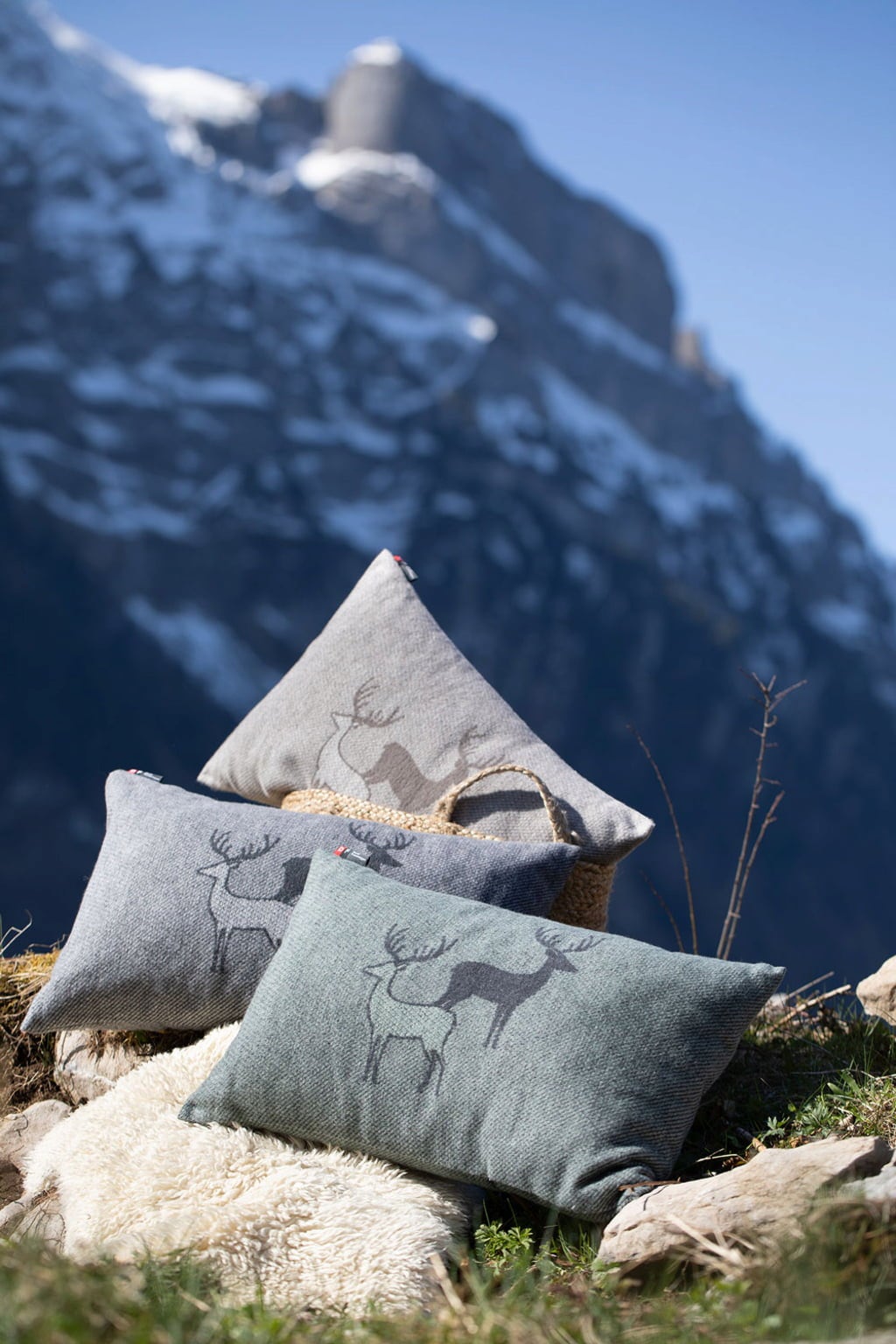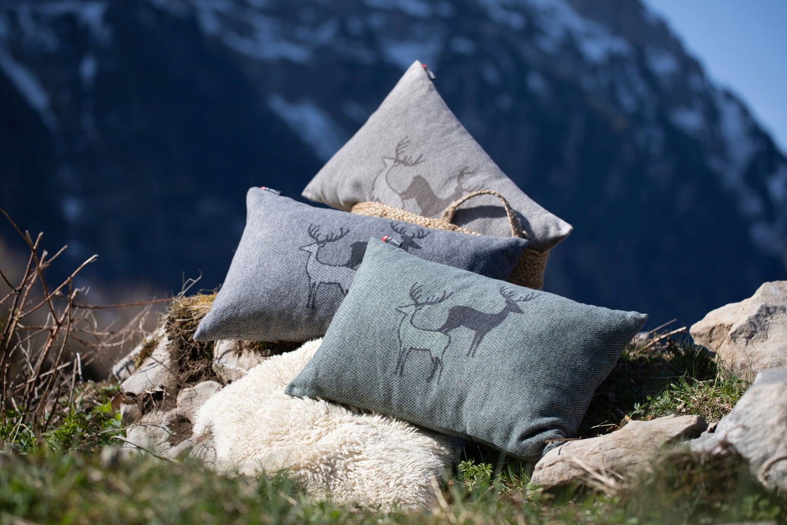 La funda de cojín, fabricada en Austria con algodón reciclado de alta calidad y adornada con un motivo decorativo de ciervo, no sólo llama la atención, sino que también cautiva por su agradable suavidad.