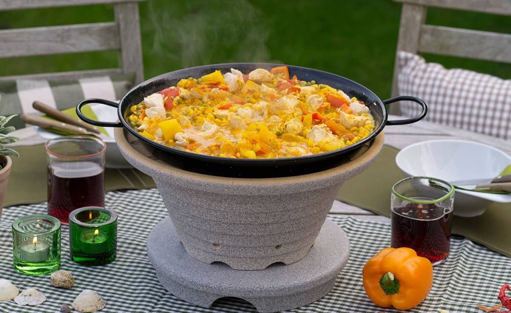 La gran sartén de acero esmaltado es ideal para usar con la barbacoa de mesa Denk Keramik, pero también es perfecta en cualquier brasero, ya que el contacto directo con el fuego no es un problema.