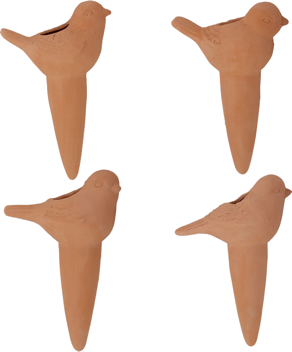 Los accesorios para el riego de terracota con forma de pájaros ayudan a mantener las plantas de interior constantemente hidratadas liberando el agua de forma gradual. Solo hay que insertarlos en la tierra y llenarlos de agua: la liberan gradualmente, lo que permite regar con menos frecuencia y mantener las plantas bien hidratadas.