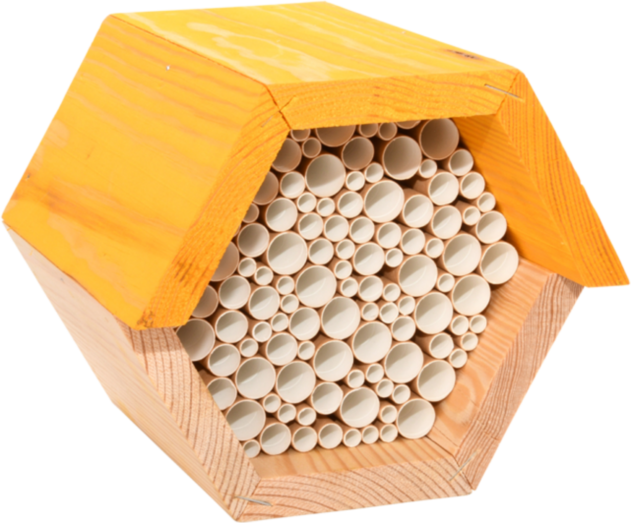 Esta casita hexagonal para abejas silvestres es una valiosa ayuda para la biodiversidad del jardín. Los tubos de cartón ofrecen las condiciones ideales para la anidación: las abejas llenan cuidadosamente cada celda con huevos, polen y néctar. Colocada en un lugar soleado y orientada al sur, contribuye activamente a la conservación de la especie.