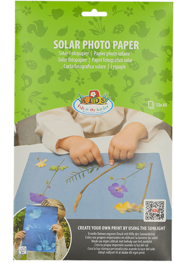Con este papel solar podrás crear obras de arte muy especiales, ¡utilizando únicamente la energía del sol! El papel reacciona a la radiación UV y crea diseños maravillosos. Encuentra algo bonito, como hojas, flores o plumas, y colócalo sobre el papel. Tras unos 10 minutos al sol, puedes volver a retirar los objetos. Ahora aclara el papel bajo el grifo durante otros 2 minutos para revelar y fijar el motivo. Después cuélgalo para que se seque y disfruta de una obra de arte muy especial.