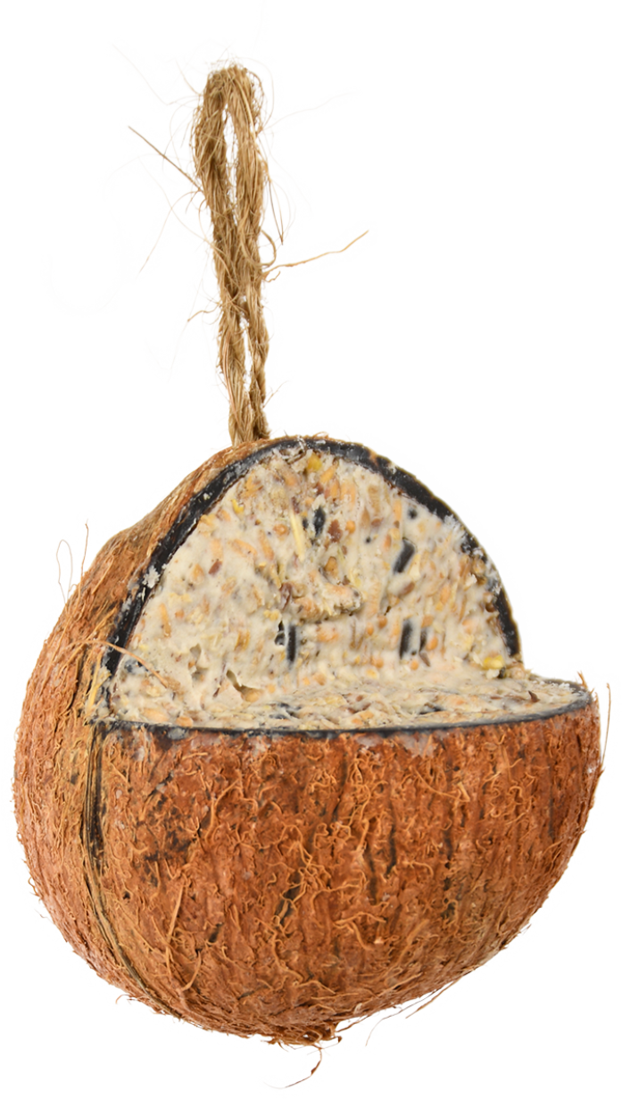 El coco relleno no sólo es un festín para los pájaros, sino también un elemento decorativo para el jardín. El pienso de invierno es rico en grasa y grano y proporciona a los animales la energía adicional que necesitan en la estación fría.