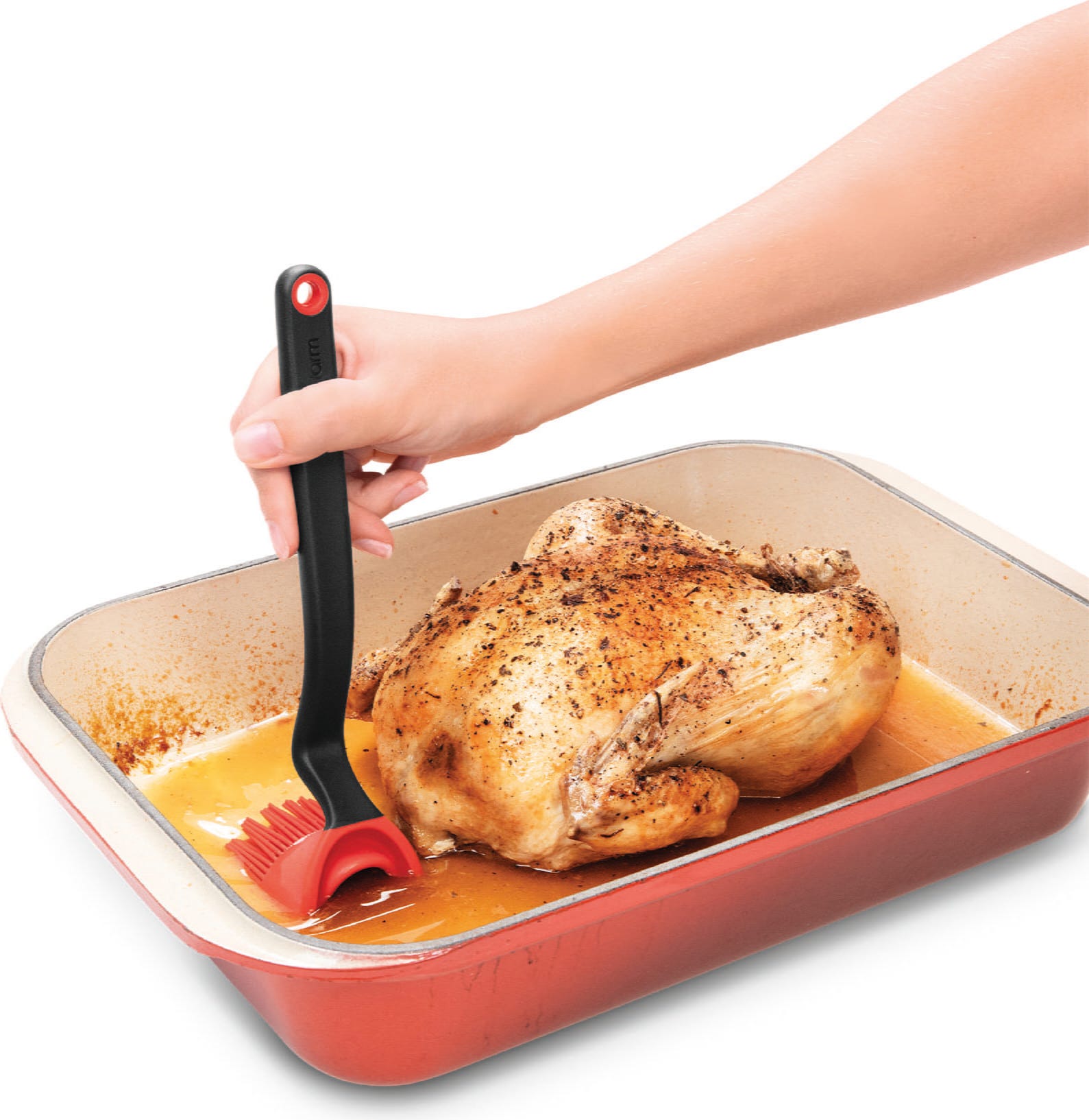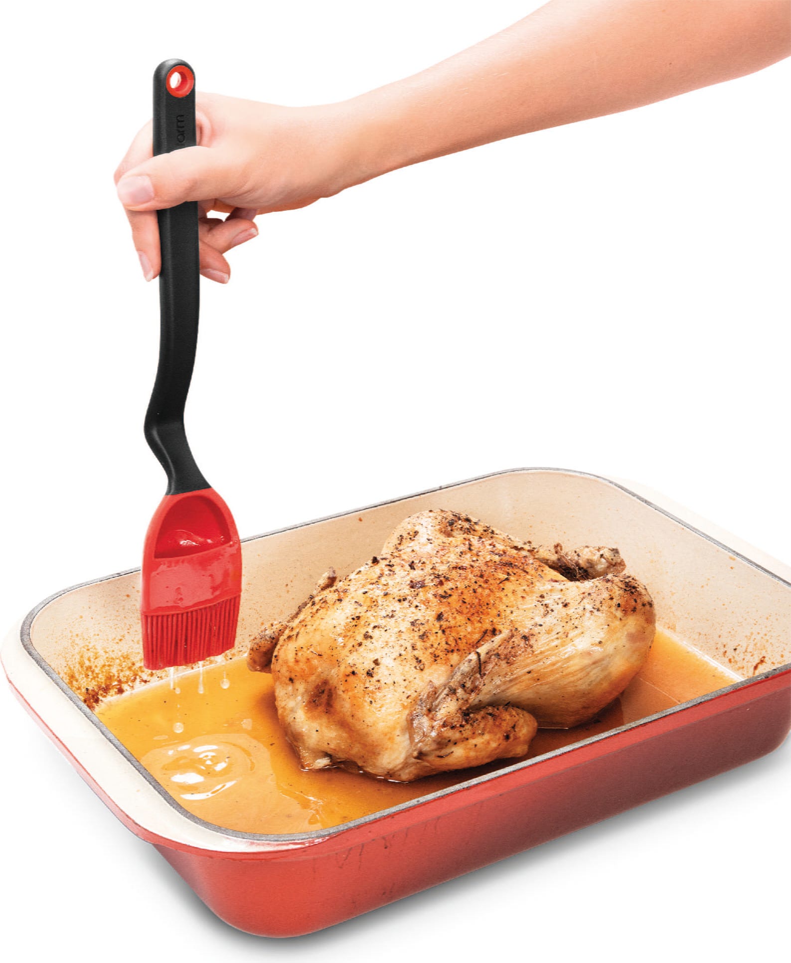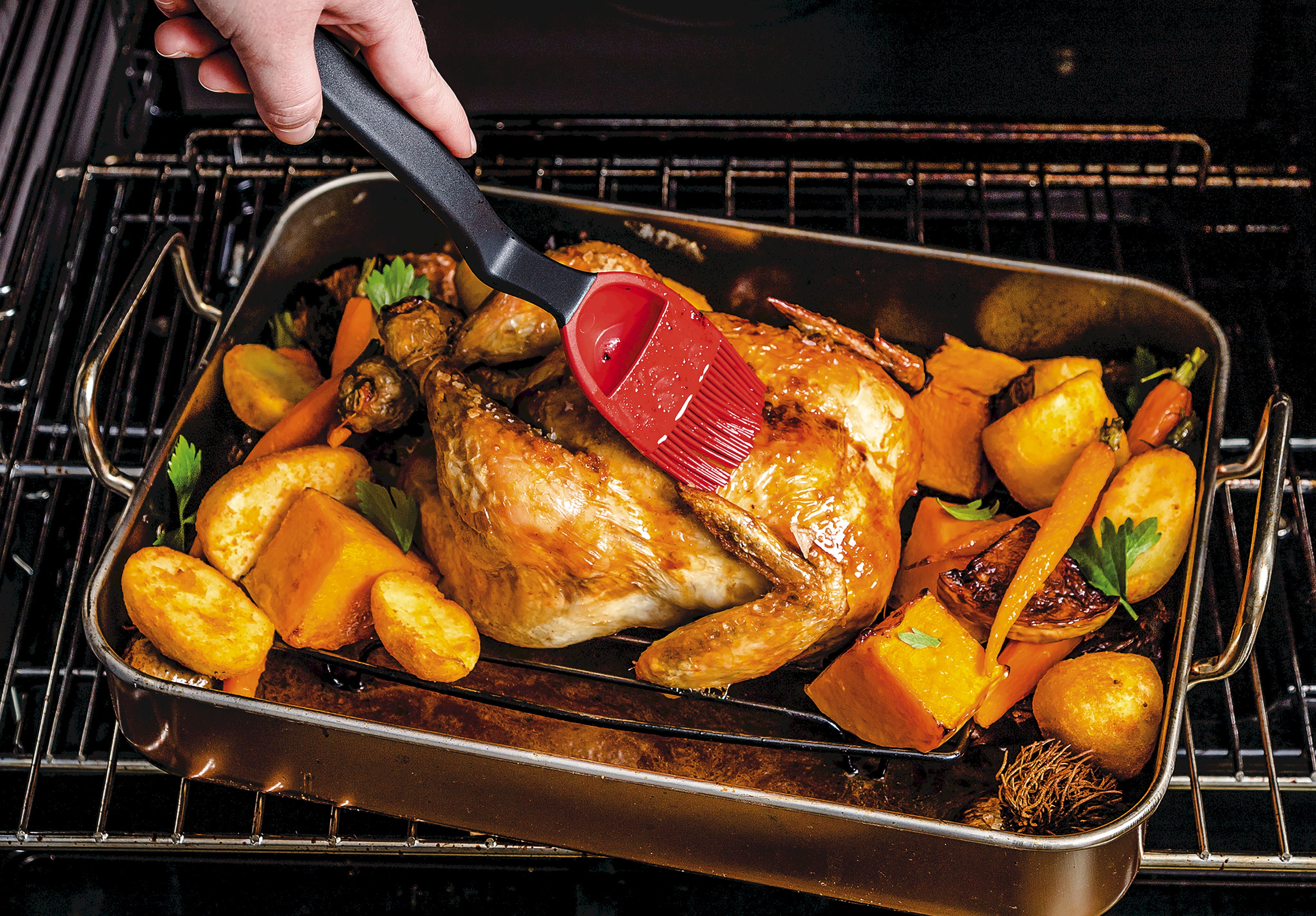 En el interior del cabezal, cuatro aberturas regulan la salida uniforme del líquido, mientras que 100 cerdas de silicona muy finas garantizan un resultado limpio y uniforme. El pincel resiste temperaturas de hasta 260 °C, es higiénico y se puede lavar fácilmente en el lavavajillas después de su uso.