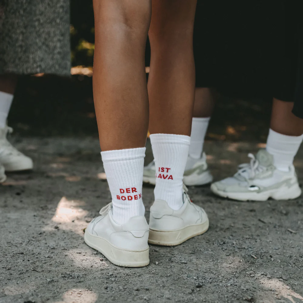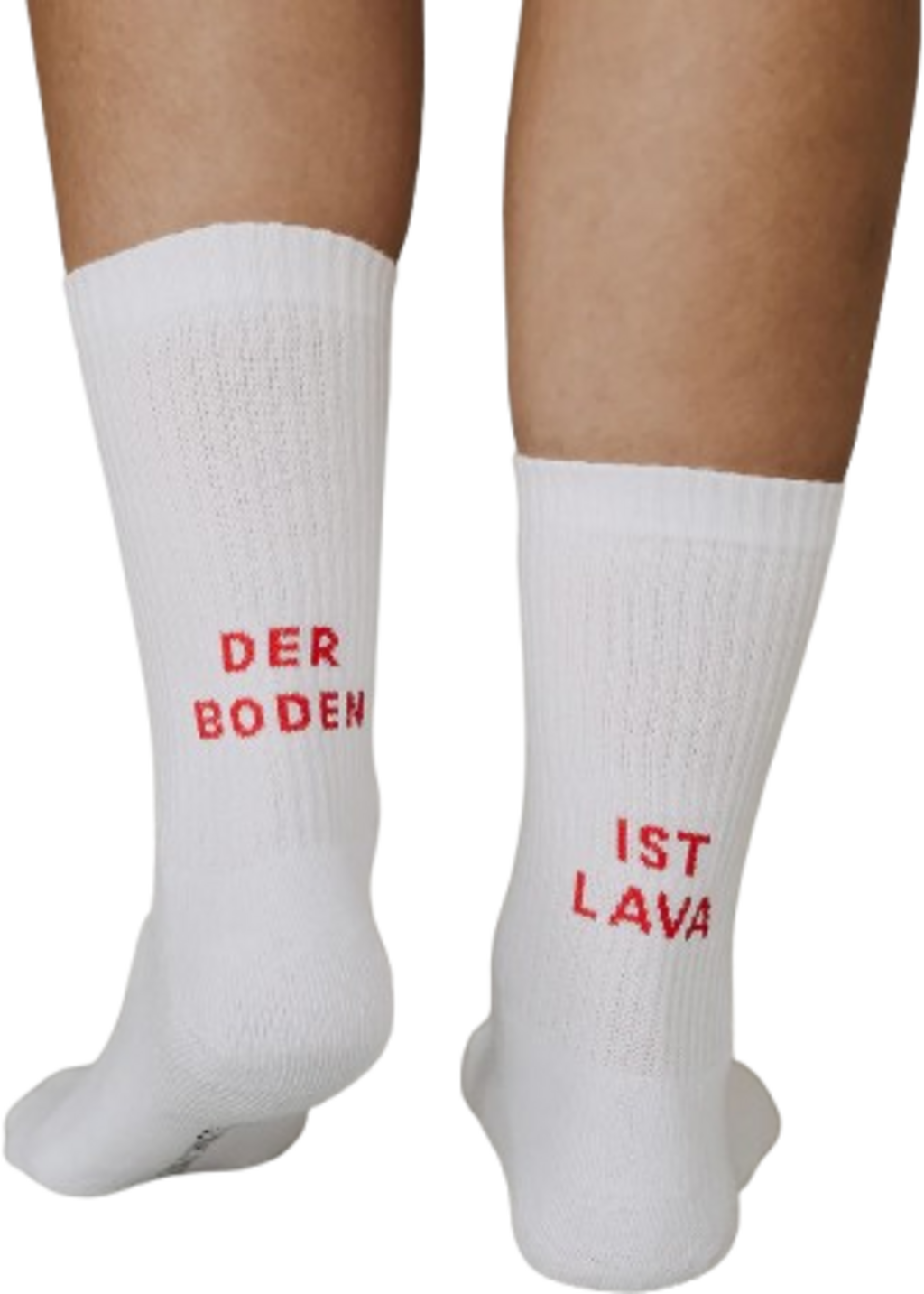 ¿Recuerdas ese juego de tu infancia en el que no podías tocar el suelo bajo ningún concepto? Con los calcetines «Der Boden ist Lava» (= el suelo es lava), ¡un pedacito de esa nostalgia estará a tus pies!