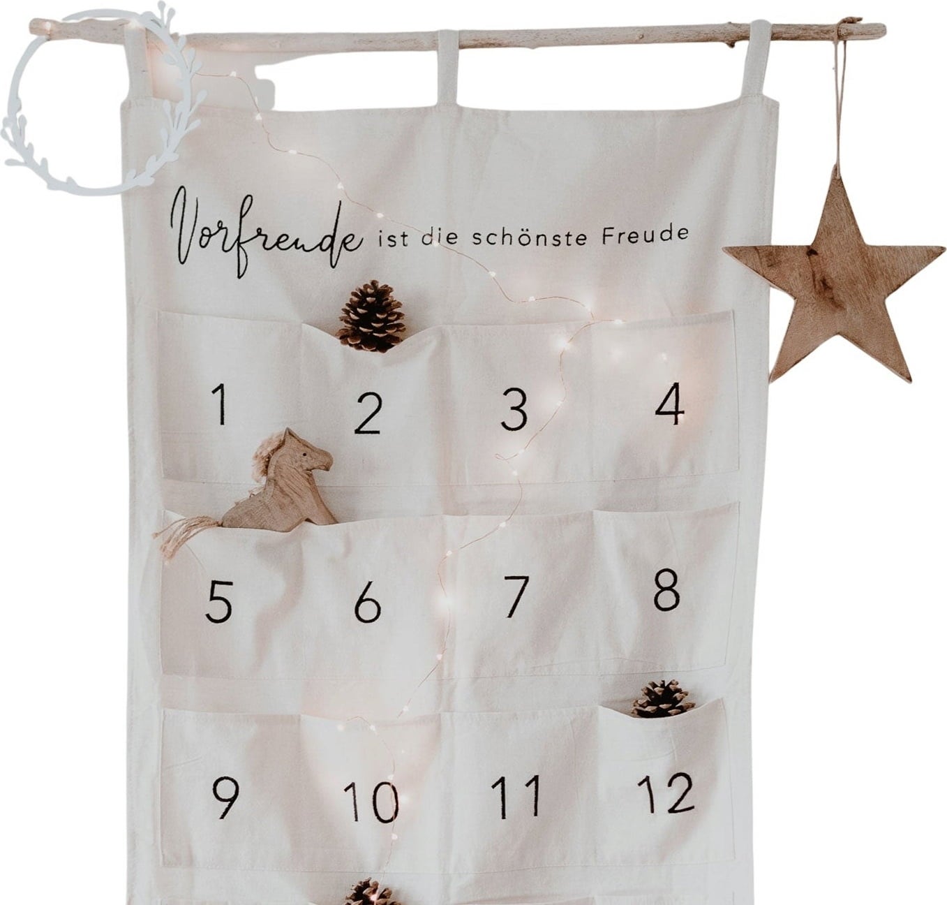 Contenido de la entrega: Calendario de Adviento (no se incluyen los adornos, las luces, los colgantes ni la rama).