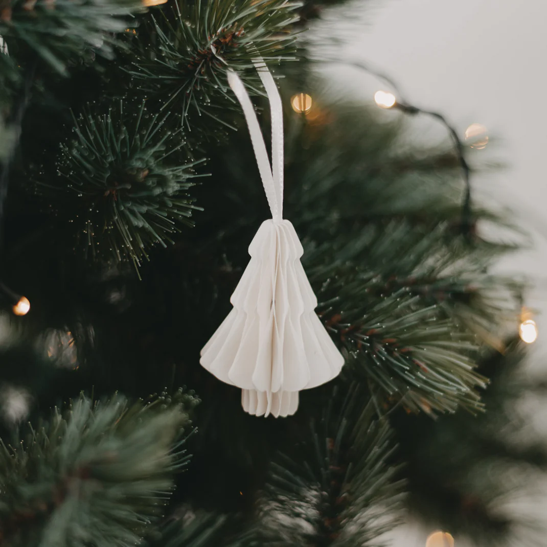 Aporta un toque natural y festivo a tu hogar con el set de 3 adornos de papel con forma de abeto. Las delicadas siluetas con efecto de panal decoran con elegancia el árbol de Navidad, las ramas, los paquetes de regalo o las ventanas.