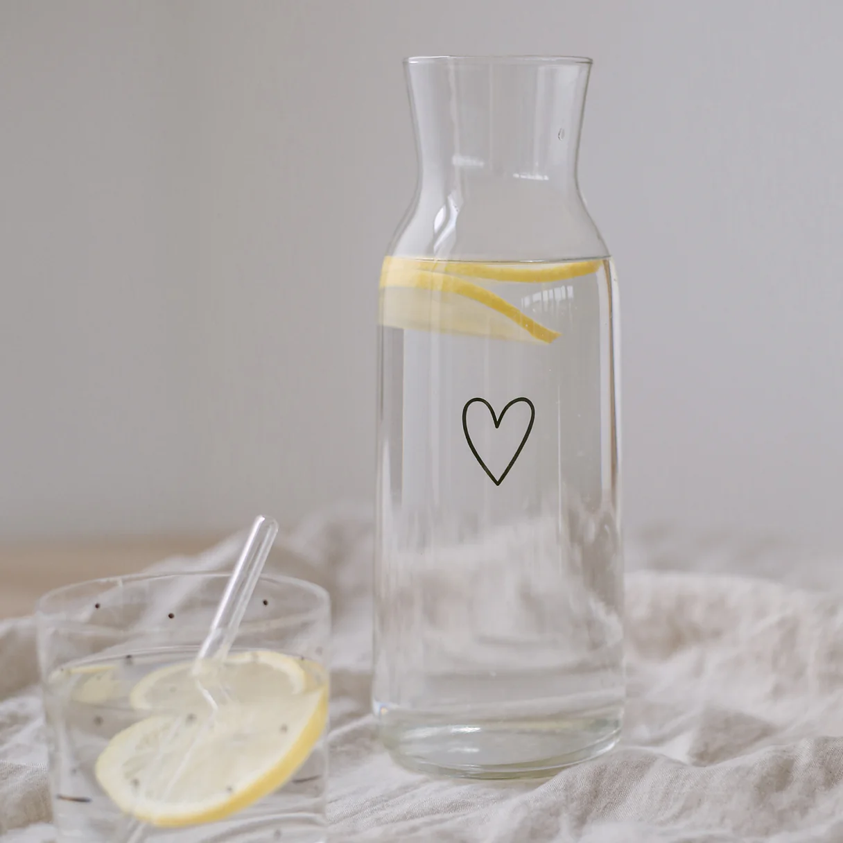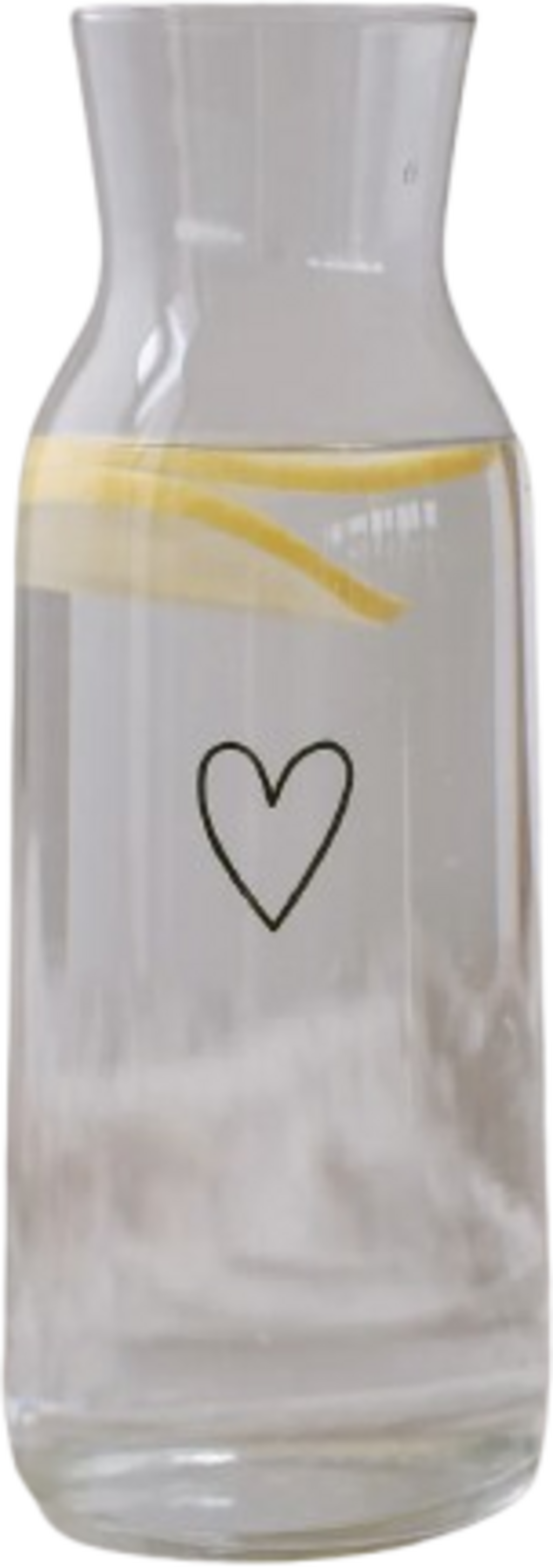 Esta jarra llama la atención en cualquier mesa. El sencillo diseño de cristal está adornado con un corazón perfilado en negro, lo que la convierte en un accesorio especial en la cocina y el comedor. Ya sea agua, limonada casera, zumo de fruta fresca, vino o leche, la jarra es perfecta para una gran variedad de bebidas. La capacidad es de aproximadamente 1 L.