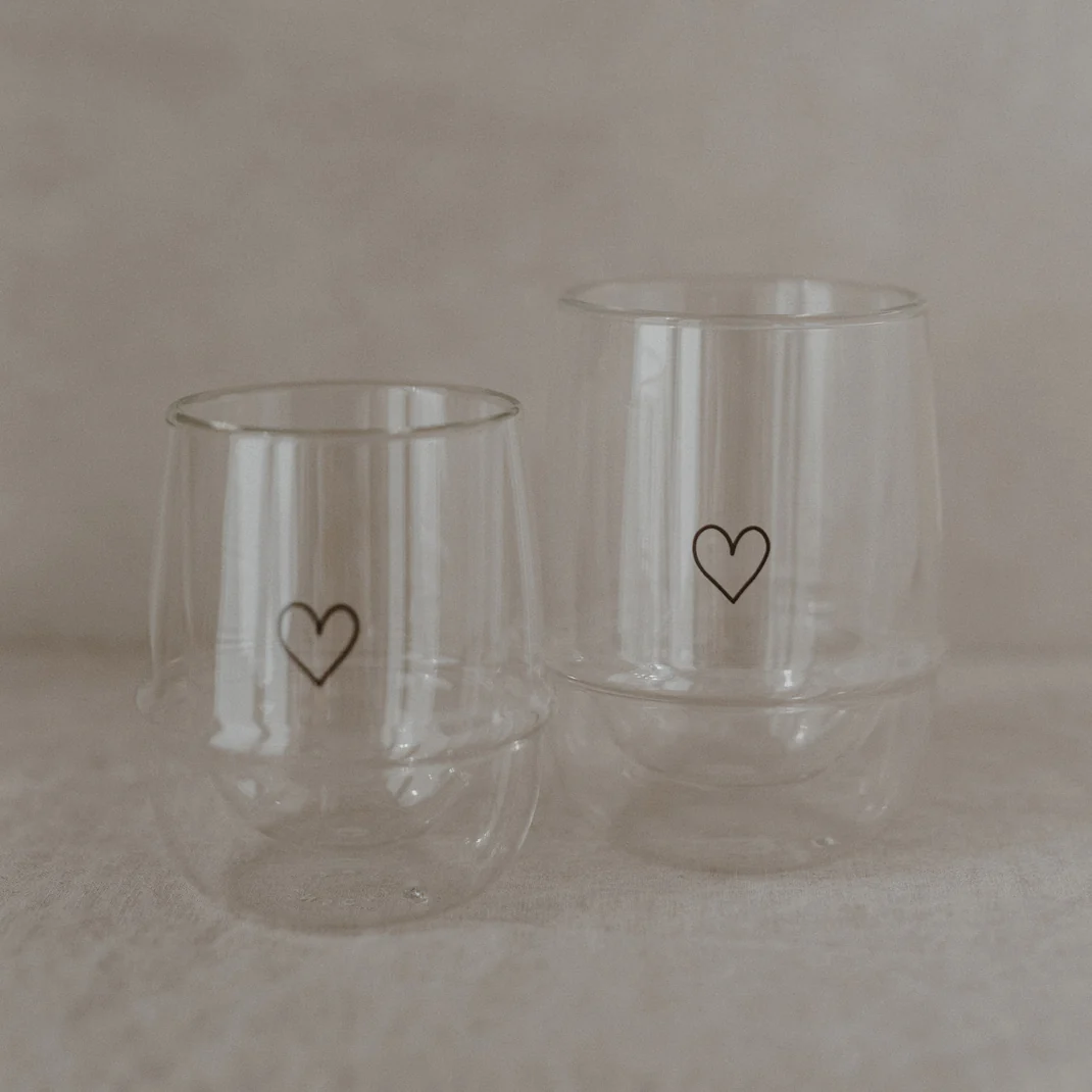 El vaso de cristal de doble pared con estampado de corazones hace que cada pausa para el café o el té sea aún más especial. El diseño de doble pared hace que la bebida parezca suspendida en el interior y mantiene el exterior agradablemente fresco, ideal para proteger las manos. Ya sea un humeante capuchino o un refrescante té helado, combina funcionalidad práctica y elegancia.