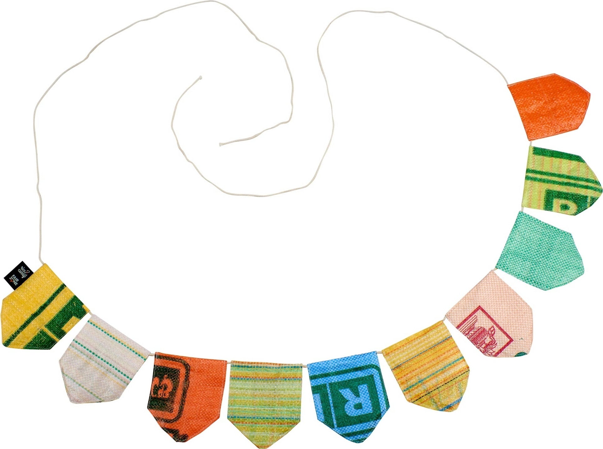 Transforma tu espacio exterior en un lugar lleno de alegría y elige una auténtica obra de artesanía con carácter genuino. Esta guirnalda única crea inmediatamente un ambiente festivo con sus vivos colores, perfecta para la próxima fiesta en el jardín, y gracias a su resistente material reciclado, resiste sin problemas incluso una ligera lluvia. Cada uno de los diez banderines triangulares cuenta una historia propia: está hecho a mano en Sri Lanka a partir de sacos de arroz usados, lo que hace que cada guirnalda sea una pieza única e irrepetible.
