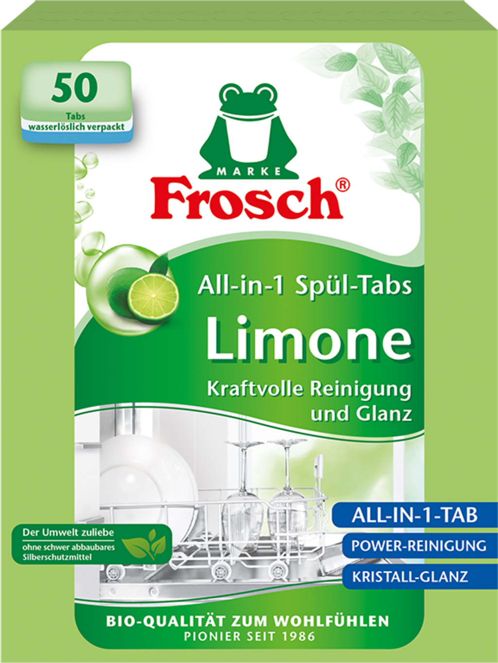 Las pastillas para lavavajillas todo en 1 de Frosch utilizan extractos de lima para eliminar incluso las incrustaciones y grasas más rebeldes en muy poco tiempo y tienen un delicado aroma a lima.