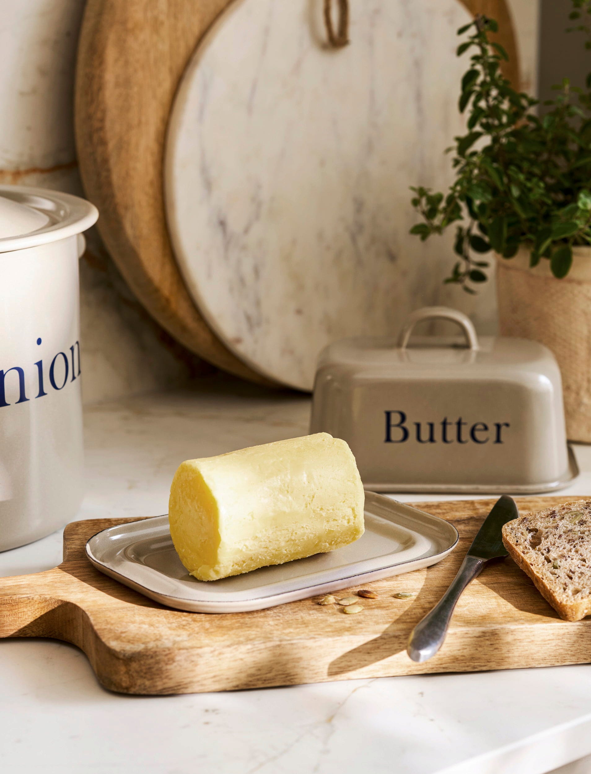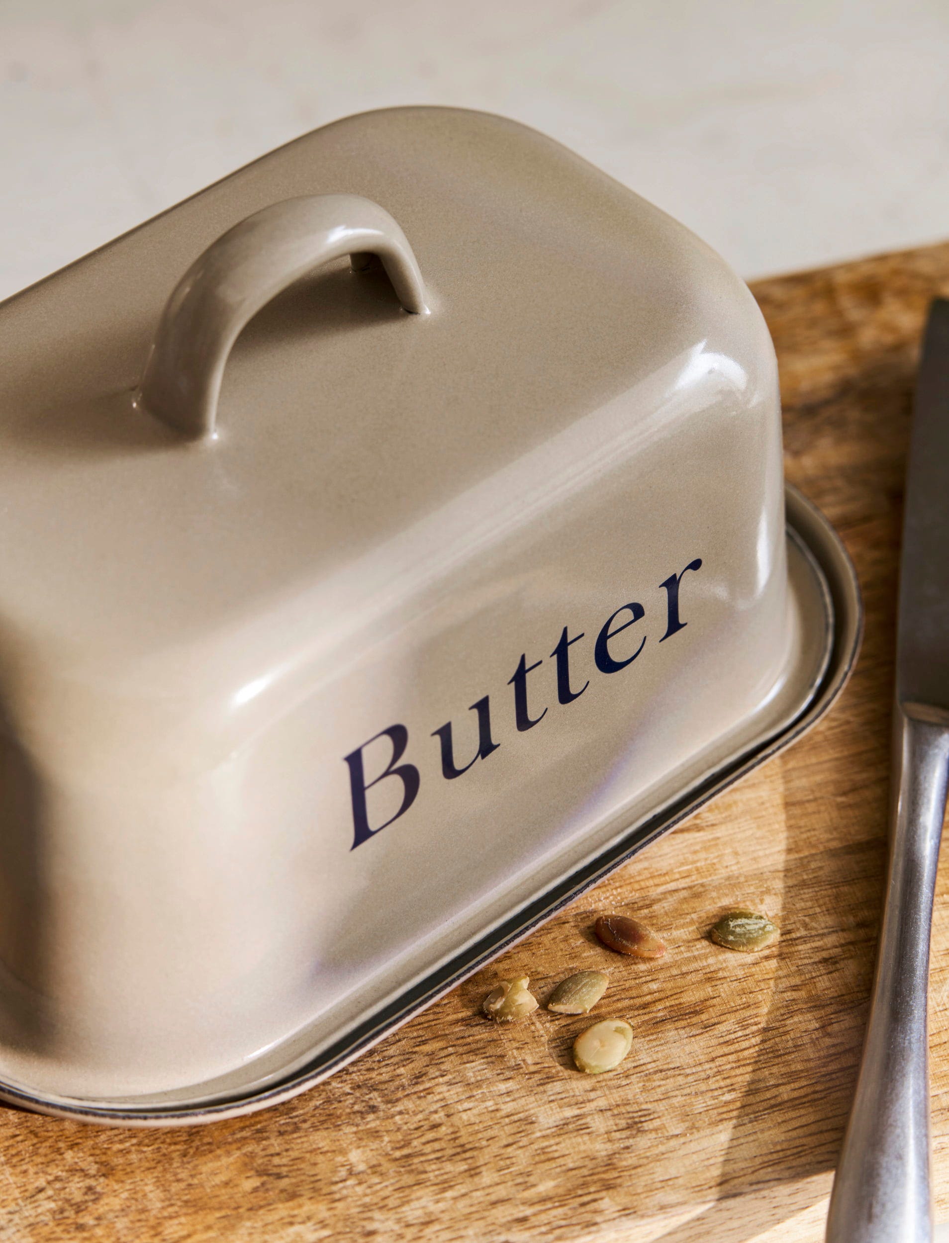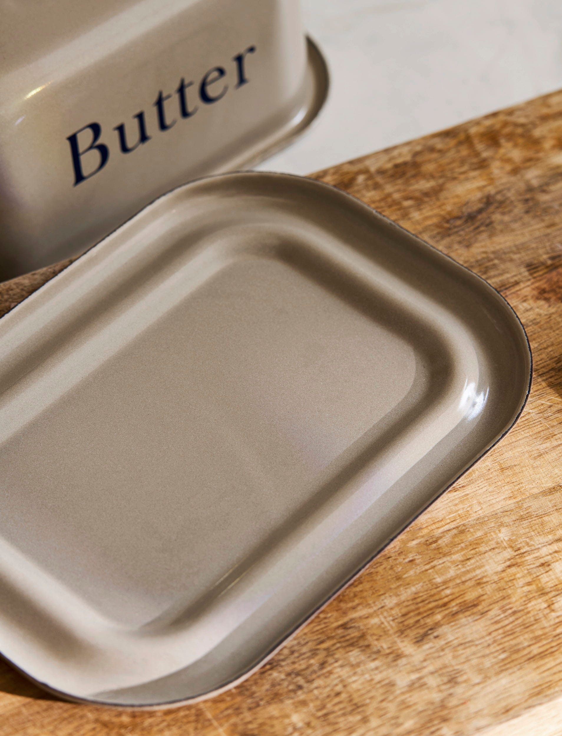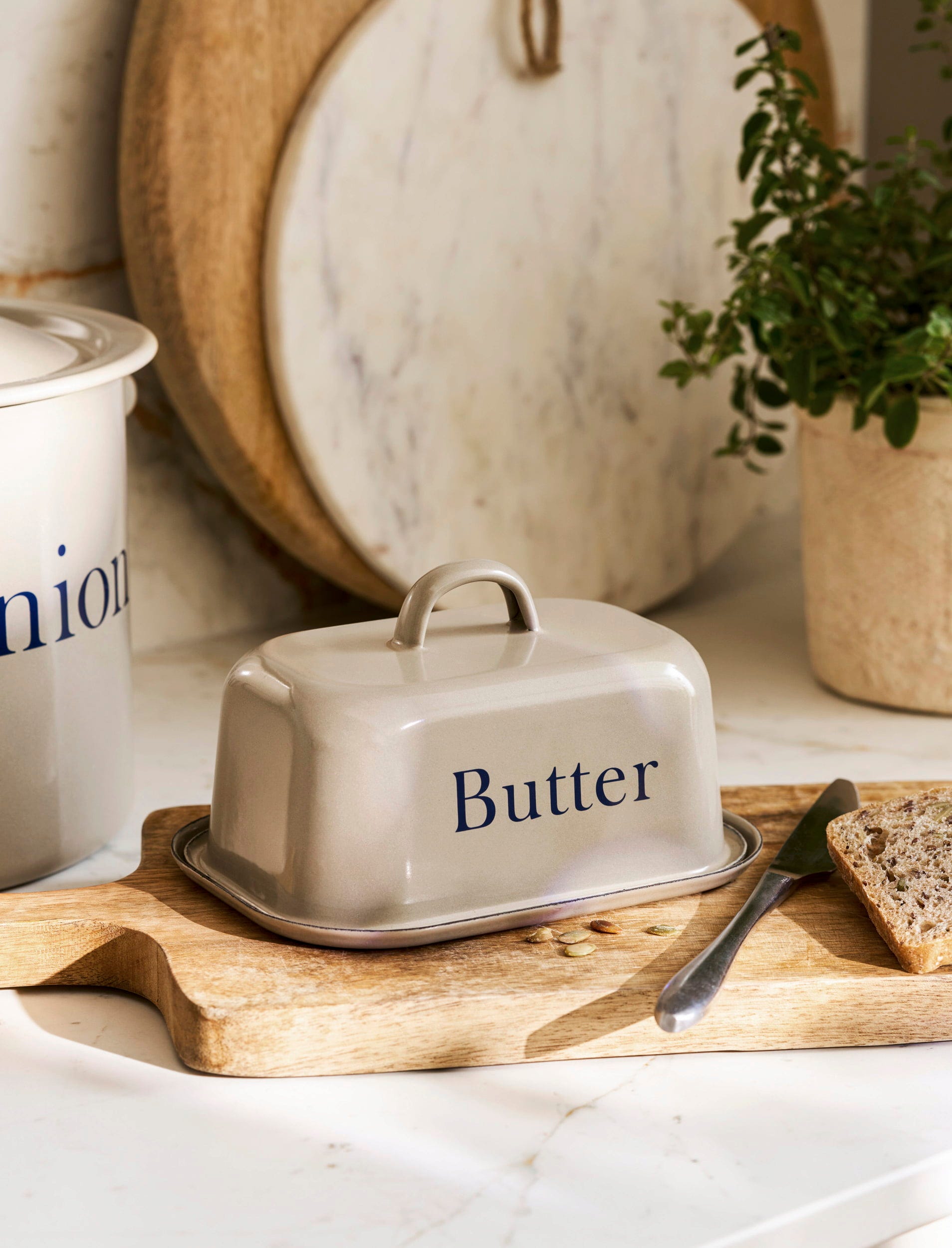 Elaborado con esmalte duradero en un cálido tono trufa, este recipiente para mantequilla es ideal para almacenar mantequilla fresca en el refrigerador, la despensa o directamente sobre la encimera, así como para servirla con elegancia.