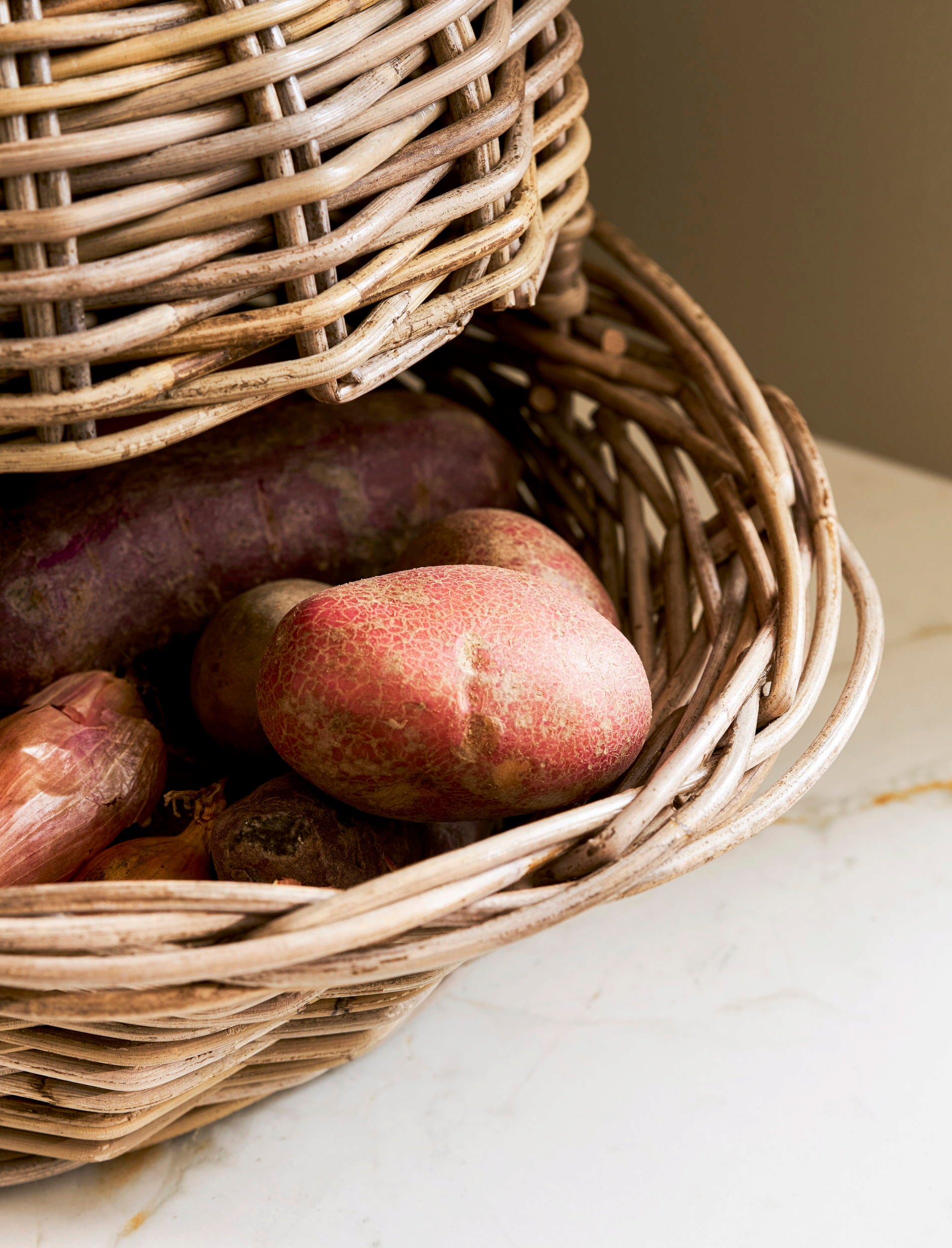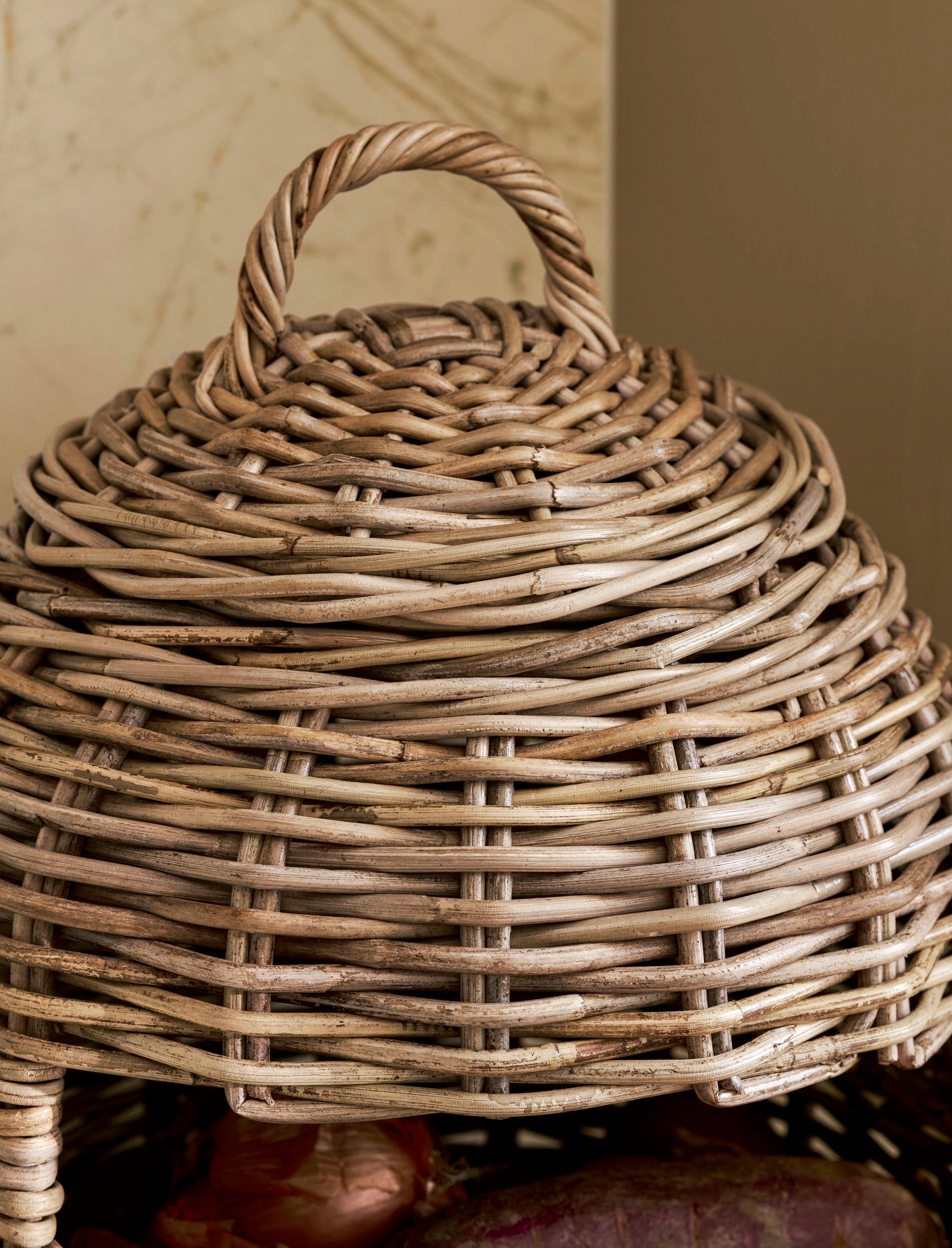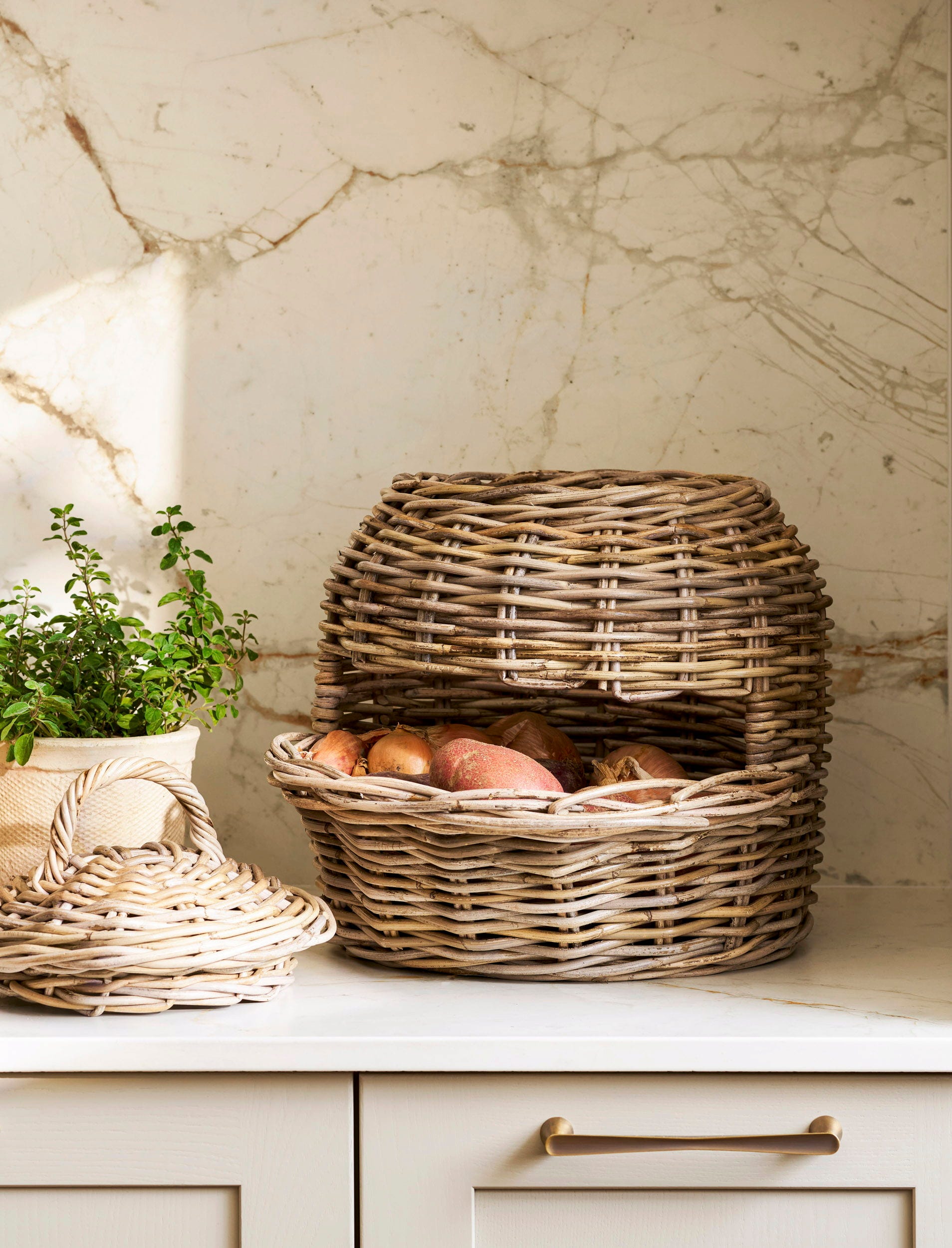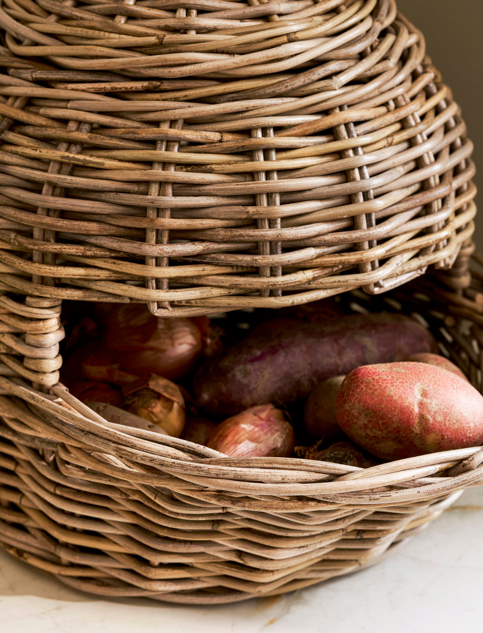 Perfecto para una acogedora cocina de estilo rústico, este cajón para verduras es ideal para almacenar patatas, cebollas y zanahorias. Elaborado artesanalmente con ratán rústico, añade un toque decorativo a cualquier cocina o despensa.
