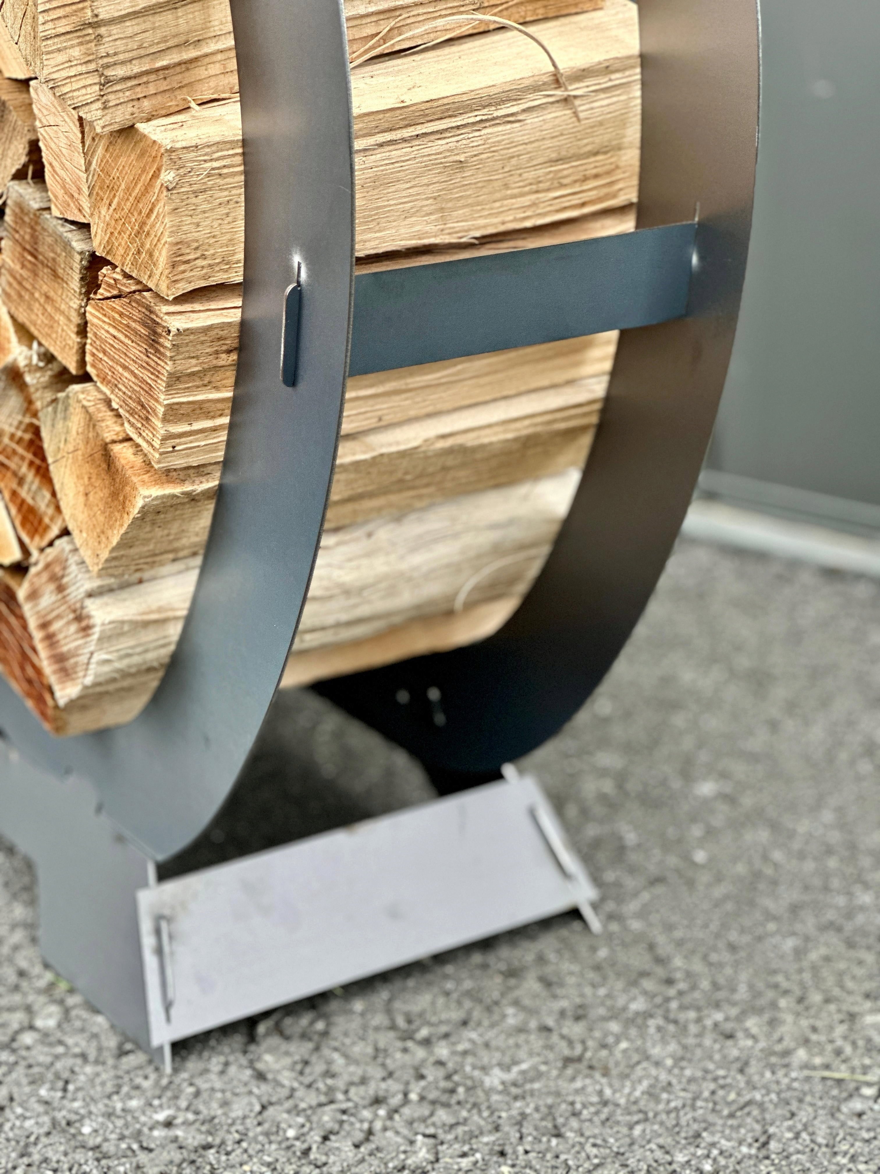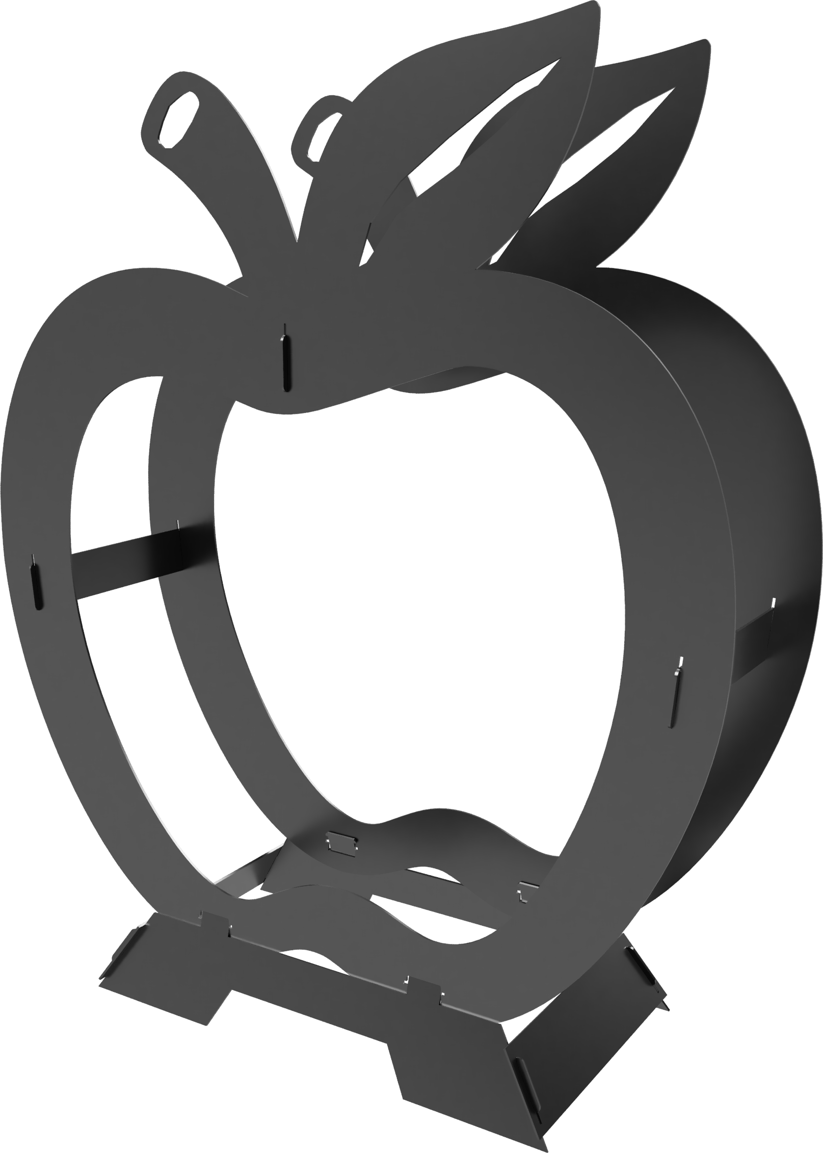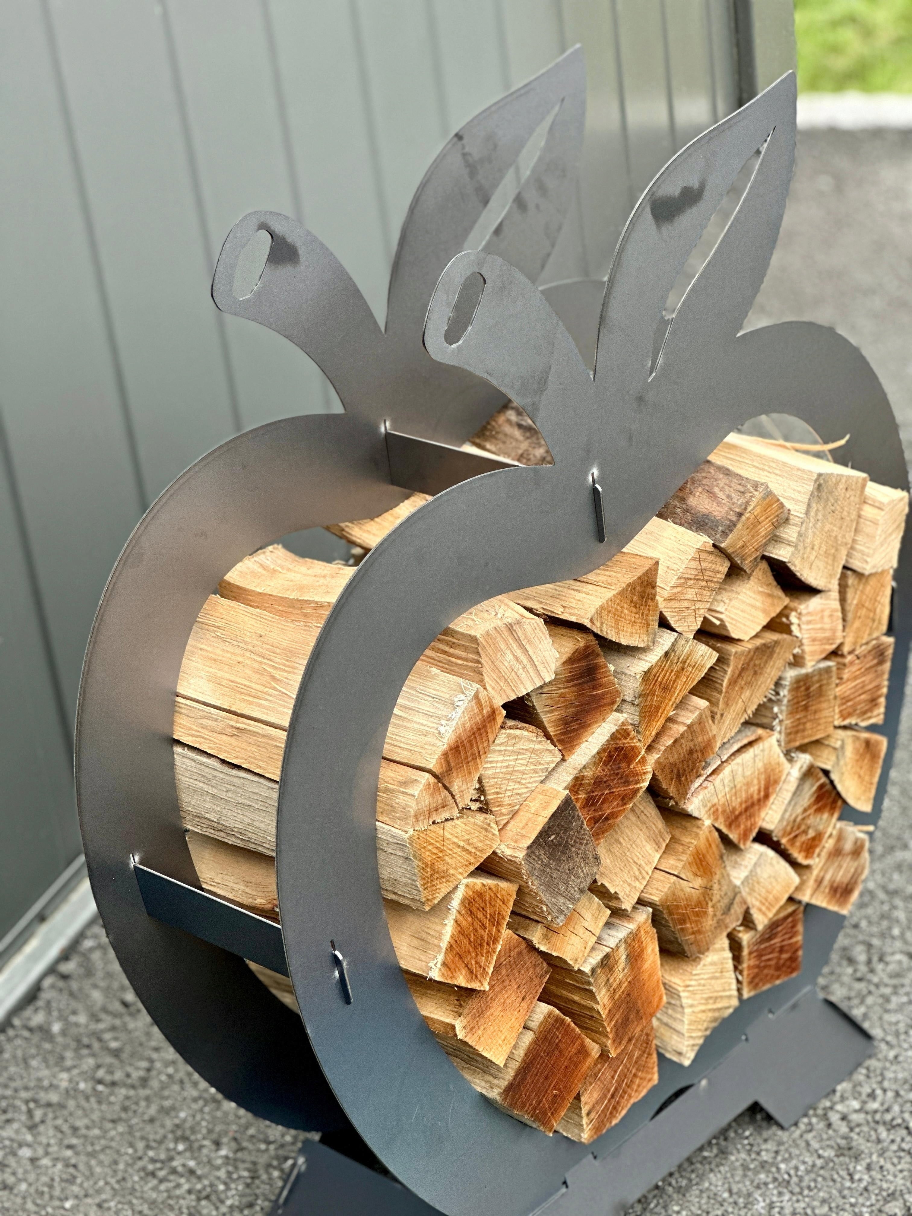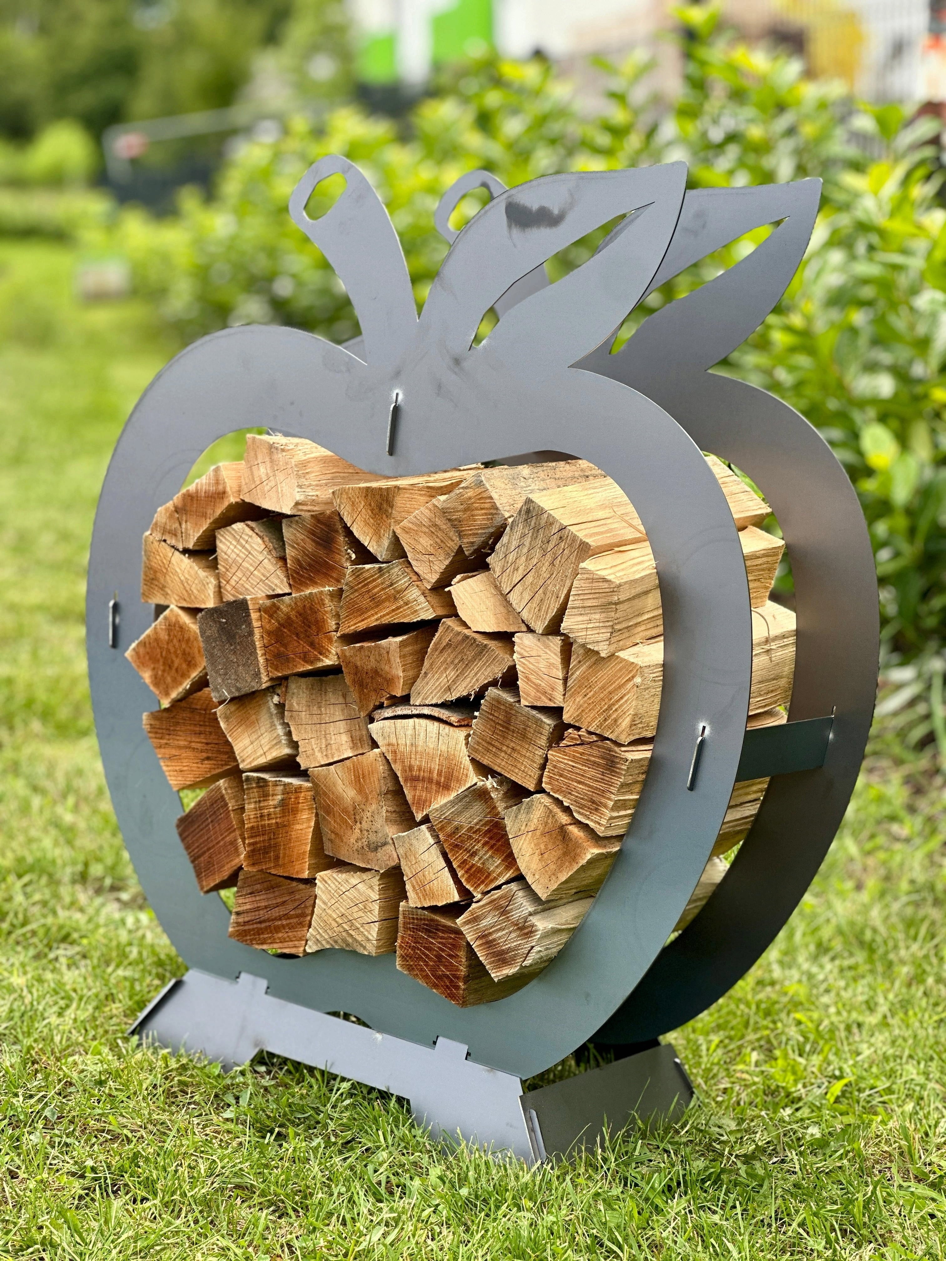 Este original soporte para leña con forma de manzana de GuC es un elemento práctico y decorativo que encaja con estilo tanto en interiores como en exteriores.