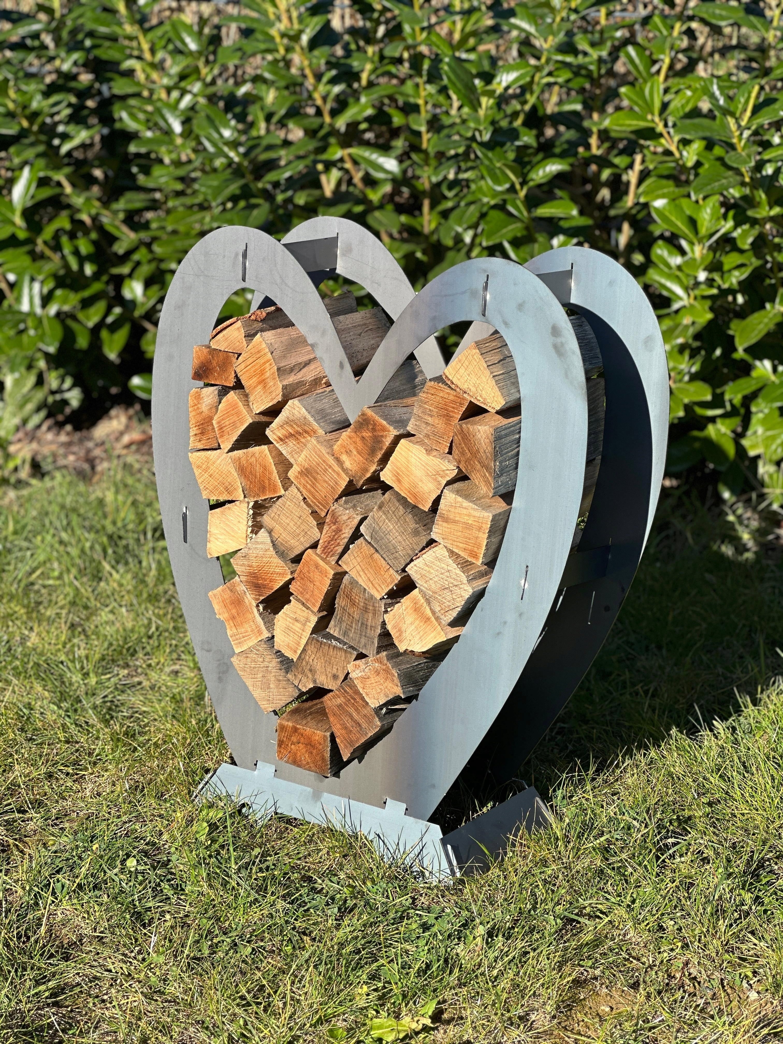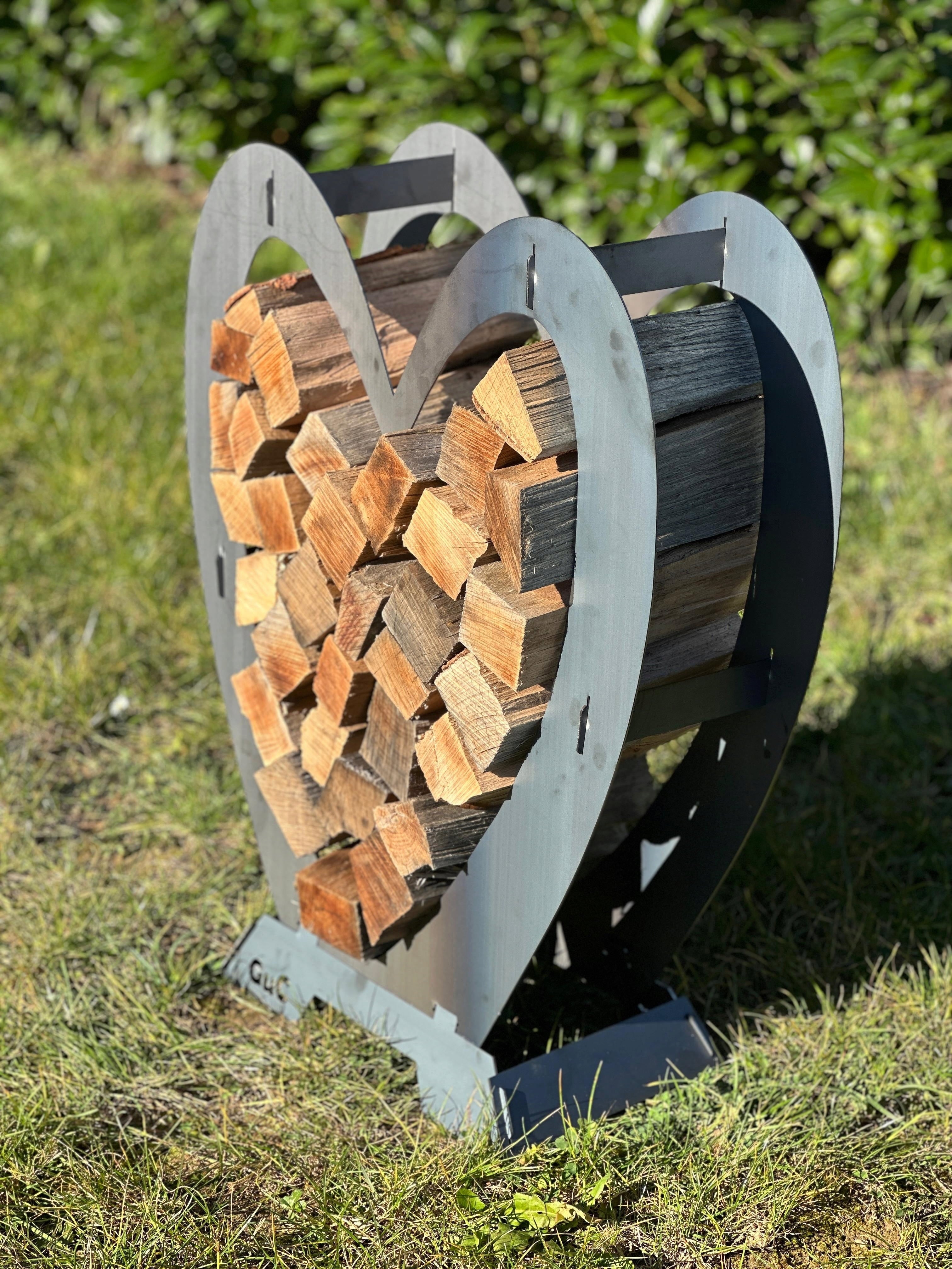Este almacenaje para leña con un romántico diseño en forma de corazón de GuC combina funcionalidad y estética, adaptándose con elegancia tanto a espacios interiores como a la decoración de exteriores.