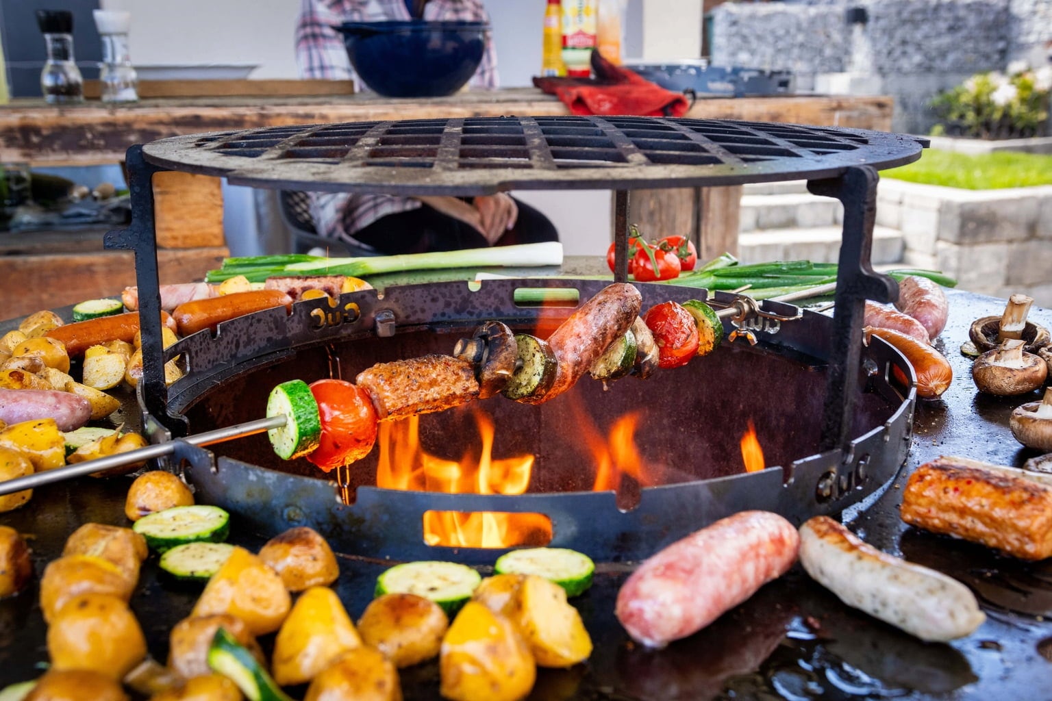 Las pequeñas muescas en el borde sirven como soporte para brochetas, para que puedas asar fácilmente brochetas de carne o verduras sobre el fuego.