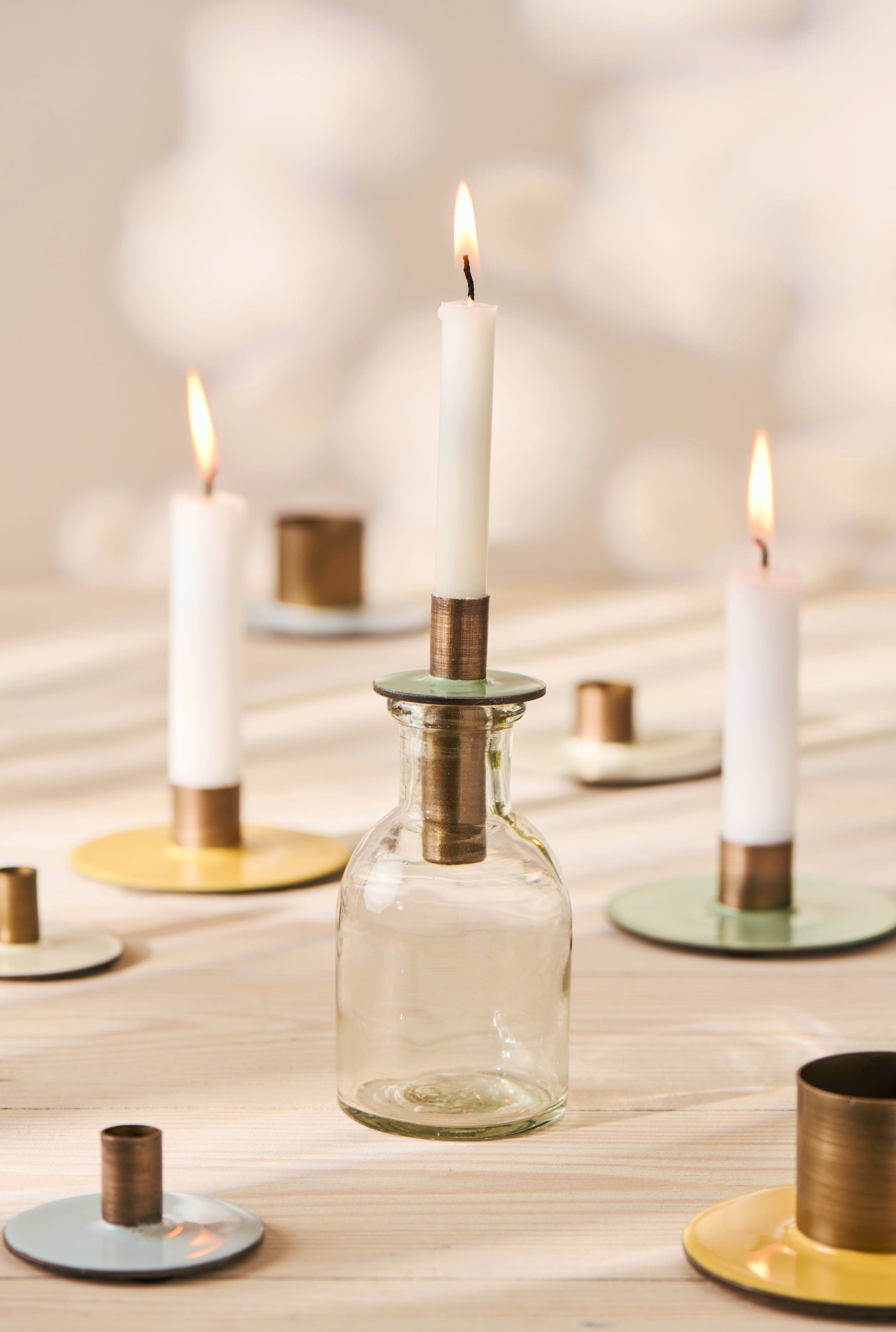 Portavelas para botellas con un diseño moderno y lineal, perfecto para convertir botellas vacías en elegantes elementos decorativos para el hogar.