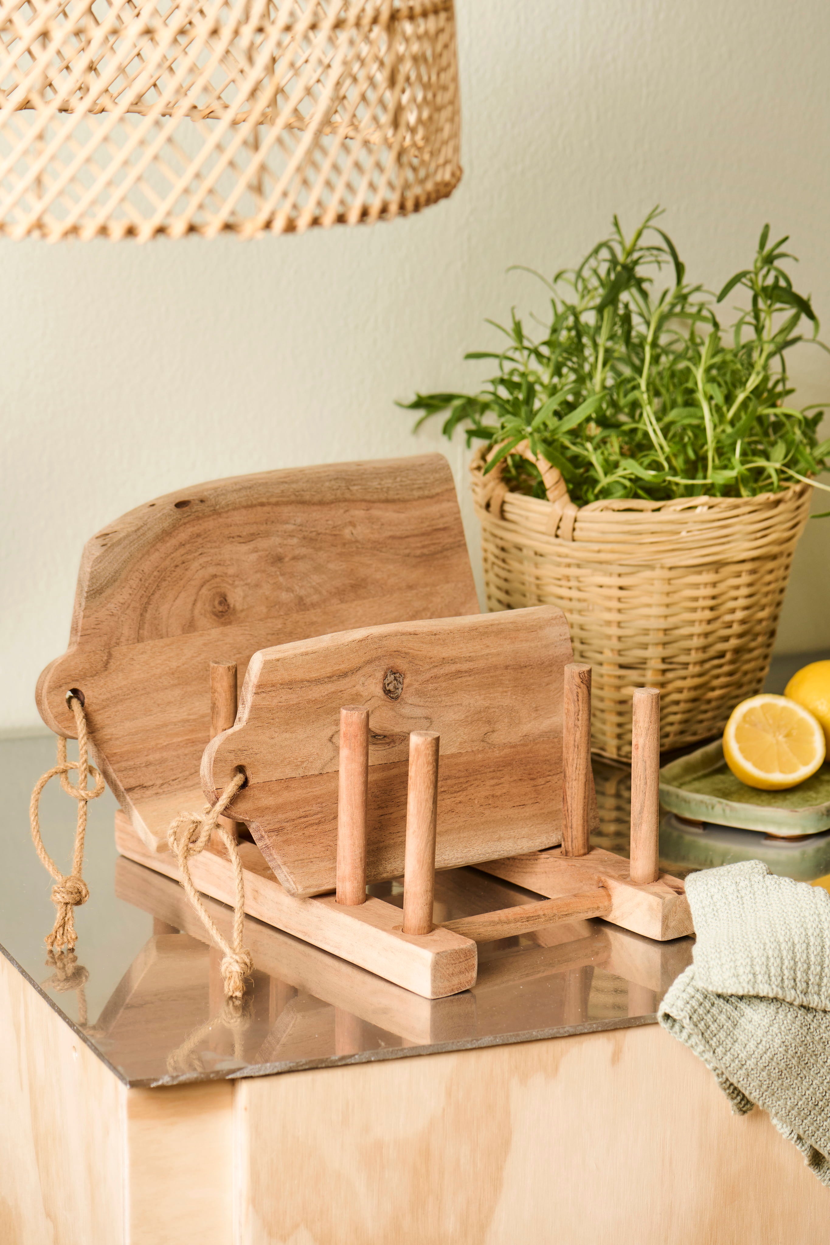 Este soporte, fabricado en madera de acacia de alta calidad, es un útil ayudante de cocina y cautiva por su encanto natural. Perfecto para tablas de cortar, platos, libros de cocina y mucho más.