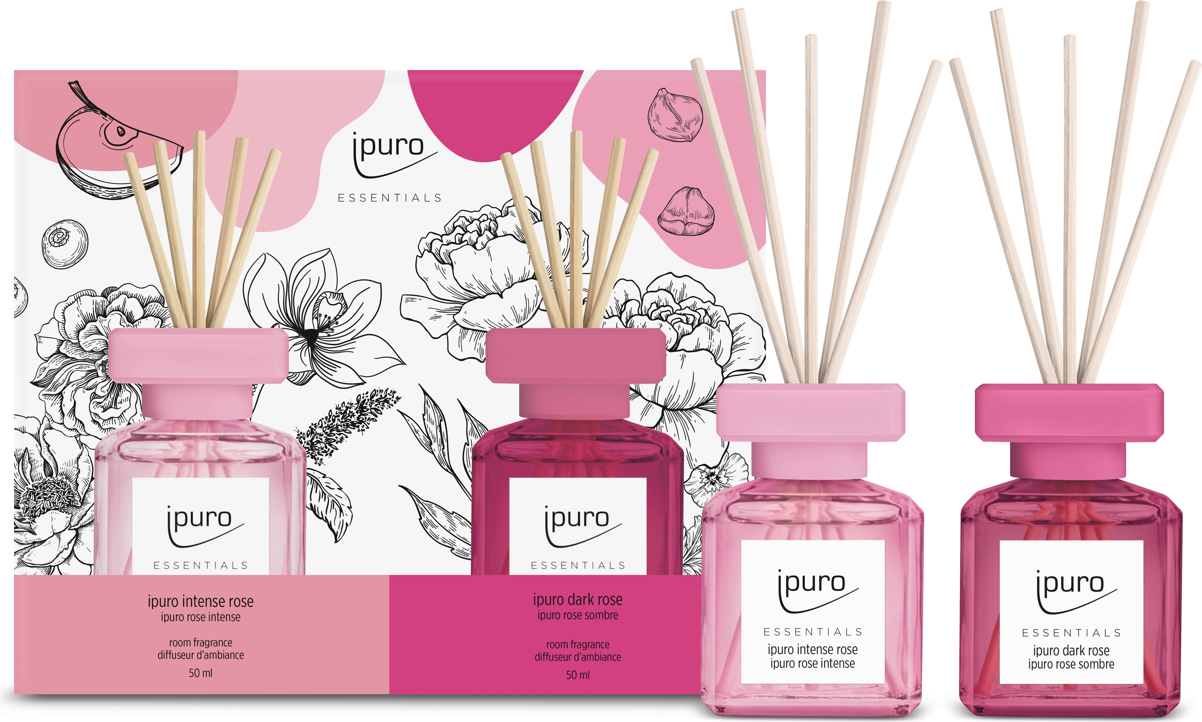 Este set contiene las dos fragancias de ambiente Rosa Intensa y Rosa Oscura de ipuro. Las fragancias de ambiente desprenden un intenso aroma floral en su espacio vital en un instante. El set también es perfecto como regalo.