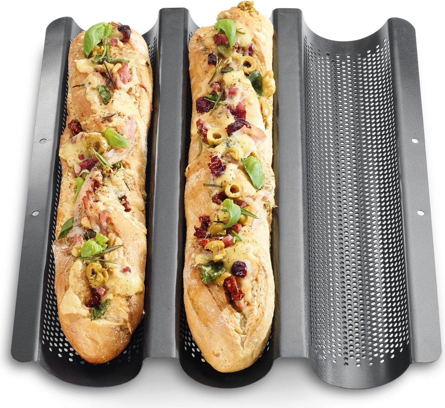 Con la práctica bandeja para horno BAKE ONE de Küchenprofi puedes preparar hasta tres baguettes crujientes, que puedes rellenar a tu gusto.