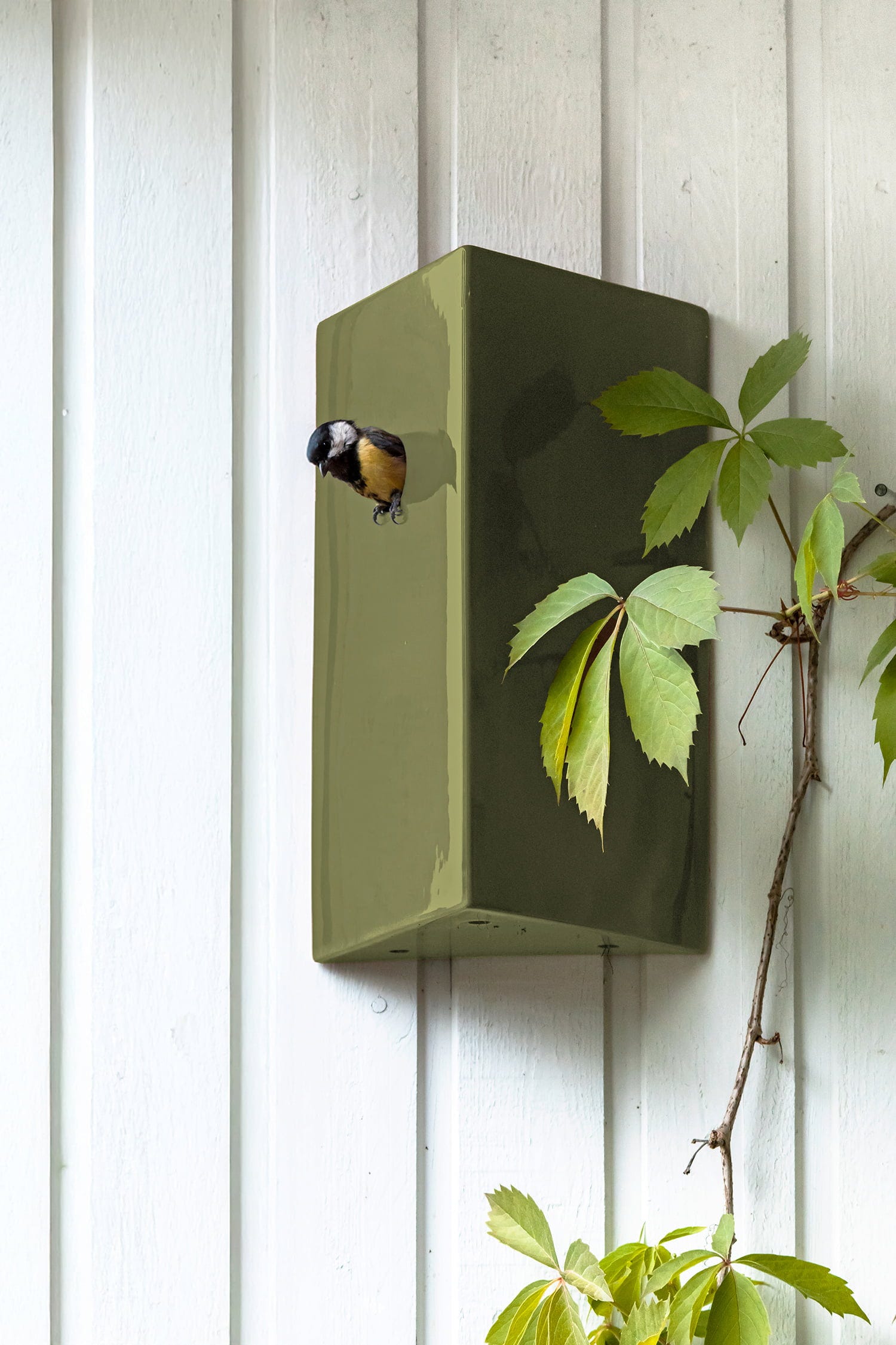 La casa está hecha a mano en Portugal con madera de pino tratada térmicamente y libre de sustancias nocivas, combinada con cerámica esmaltada. En el interior, bajo el orificio de salida, la superficie está ligeramente rugosa para facilitar la salida de los pájaros pequeños.