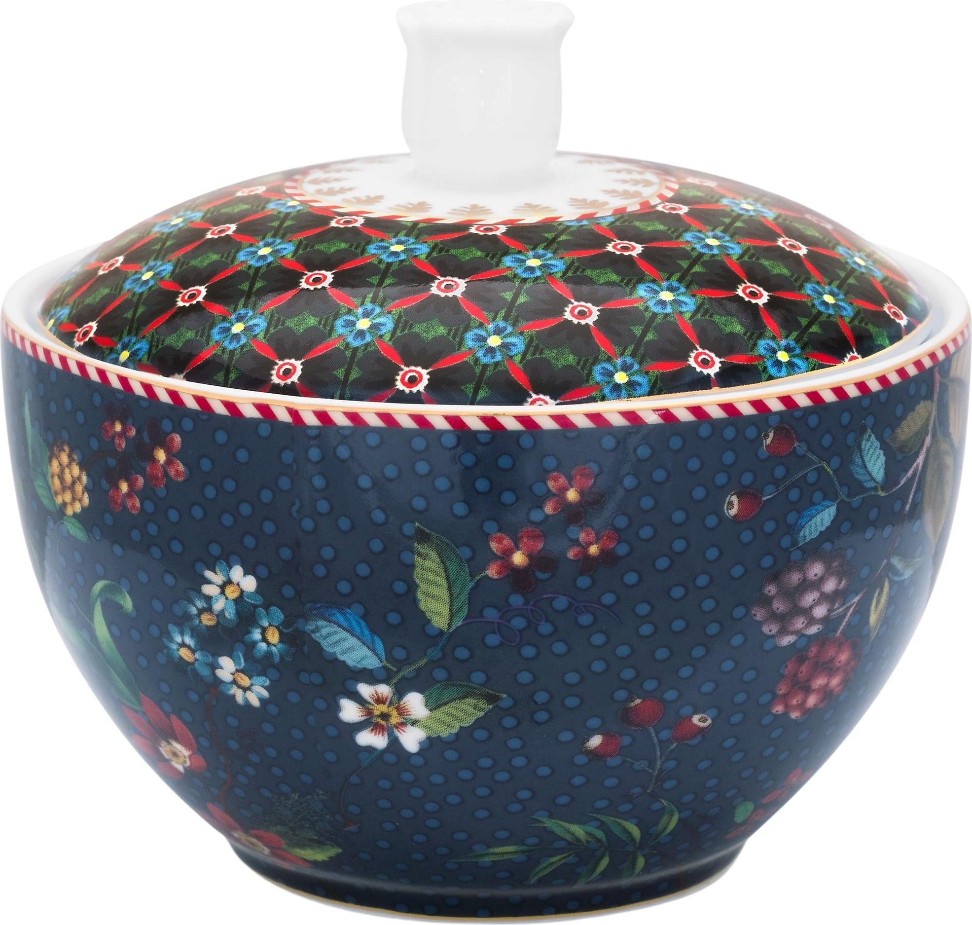 Añade un toque de encanto a tu mesa con este precioso azucarero de Pip Studio. Destaca por su diseño único y rico en detalles: el cuerpo, de un azul marino intenso, está decorado con un delicado motivo integral de pequeños lunares, sobre el que se despliega un animado alboroto de flores y bayas de vivos colores.
