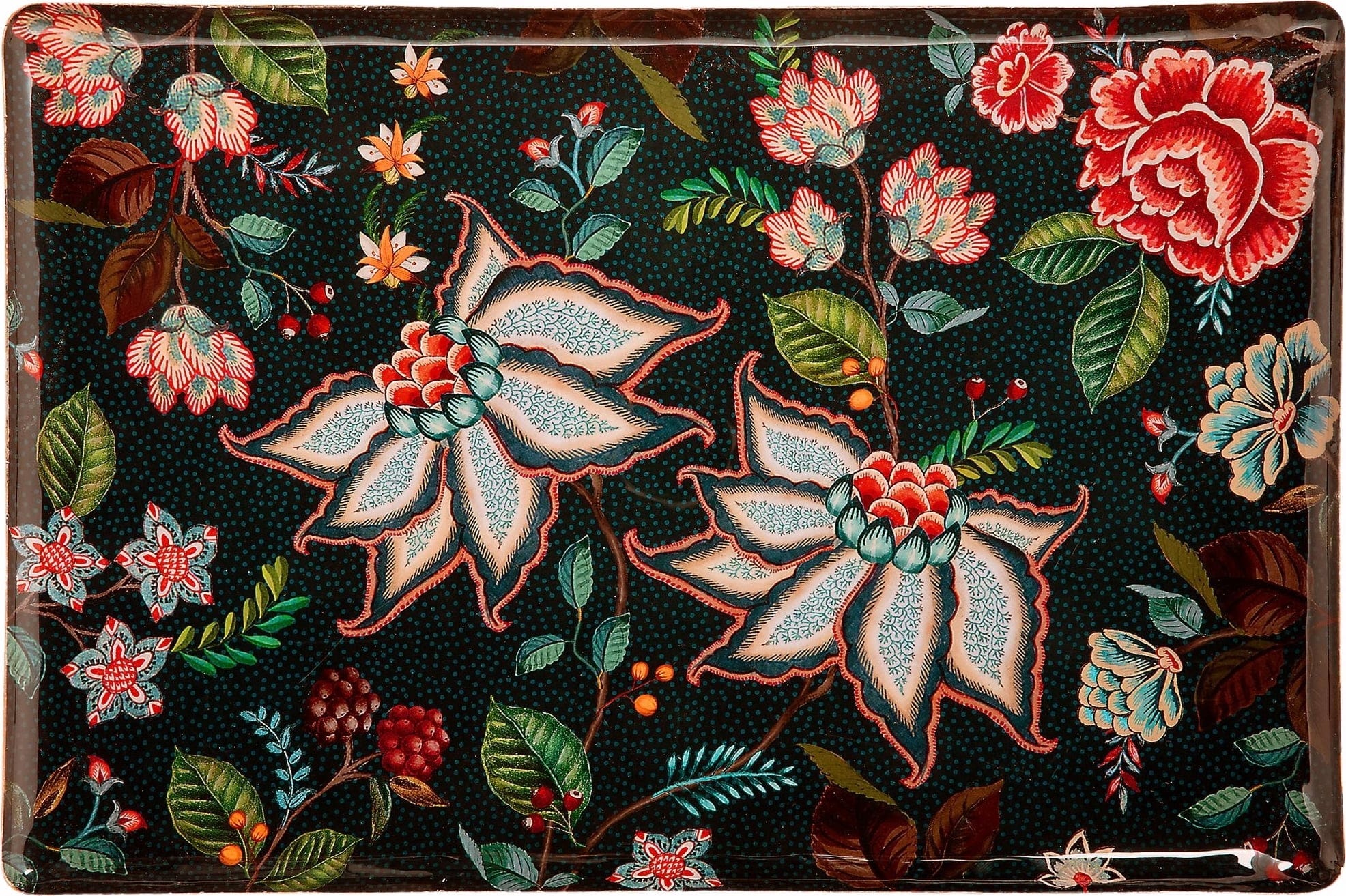 La bandeja está decorada con un sofisticado motivo floral azul oscuro que se extiende por toda la superficie. Las flores y bayas diseñadas con imaginación crean un diseño armonioso y llamativo. Con su elegante estilo, esta bandeja se convertirá inmediatamente en un encantador punto focal en su hogar.