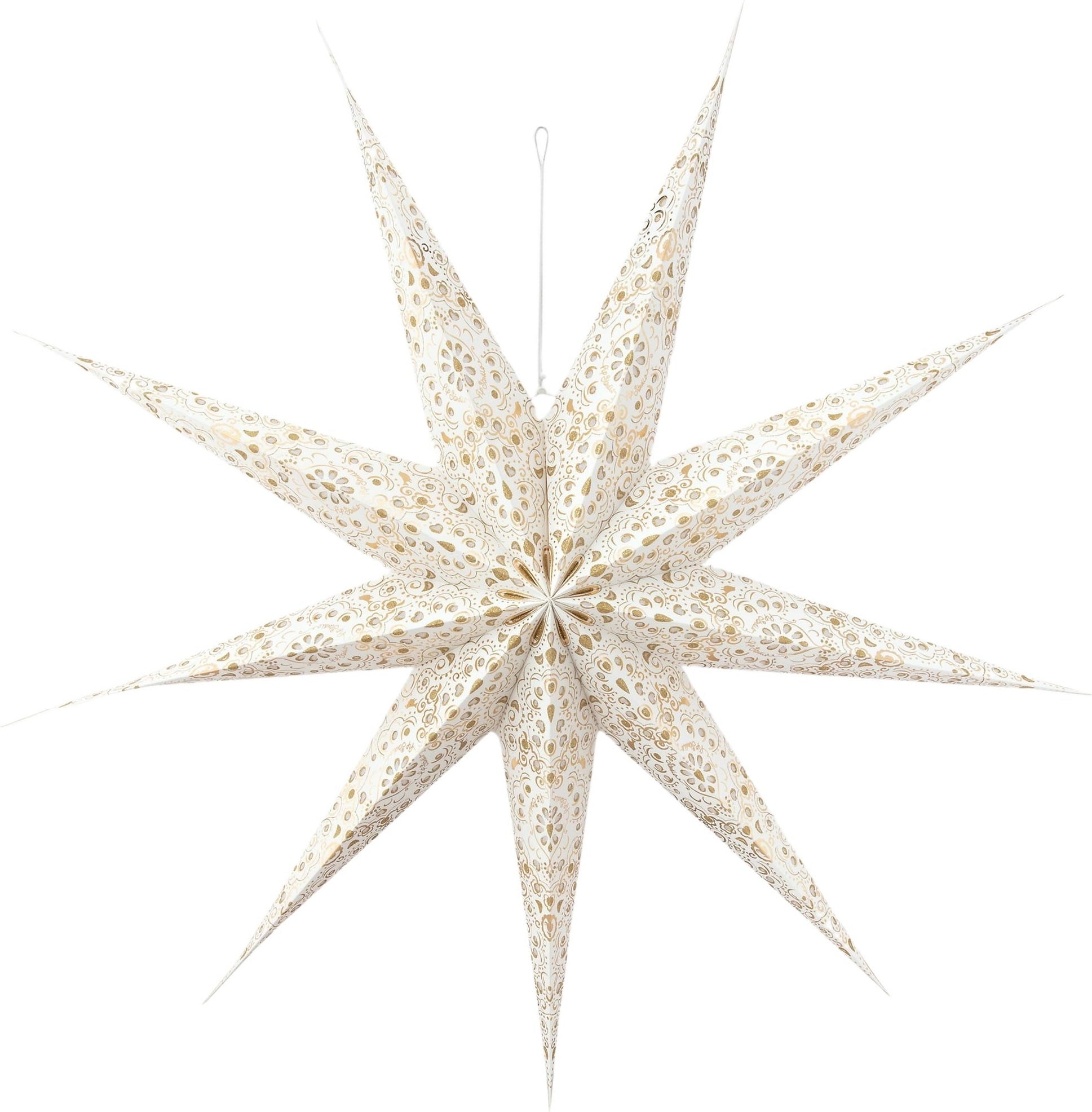 Impresiona por su diseño elegante y delicado: un refinado tono crema sirve de base, enriquecido con brillantes motivos decorativos dorados que realzan su carácter festivo. Las puntas finamente curvadas y puntiagudas confieren a la estrella una llamativa profundidad tridimensional y una forma armoniosa.