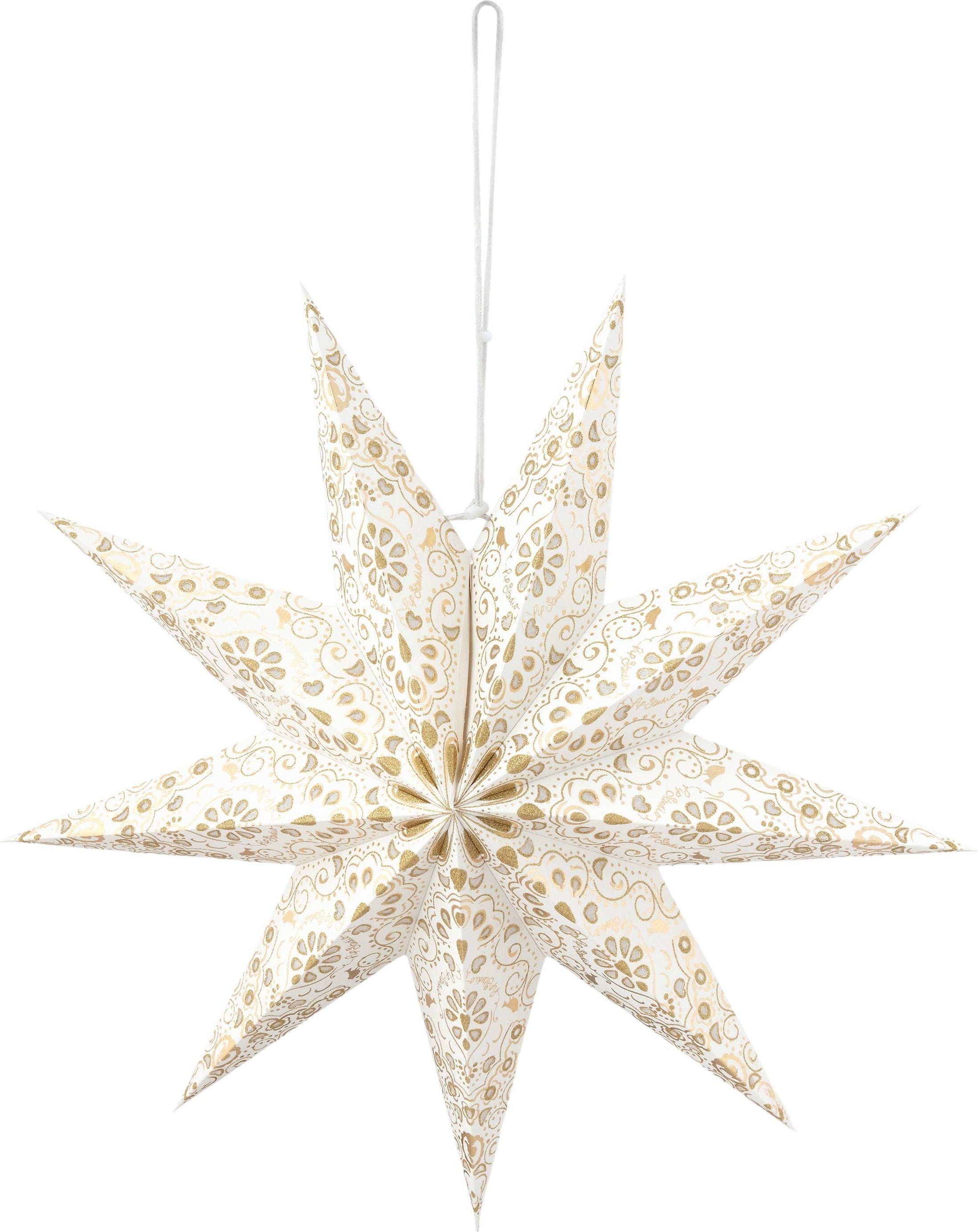 Impresiona por su diseño elegante y delicado: un refinado tono crema sirve de base, enriquecido con brillantes motivos decorativos dorados que realzan su carácter festivo. Las puntas finamente curvadas y puntiagudas confieren a la estrella una llamativa profundidad tridimensional y una forma armoniosa.