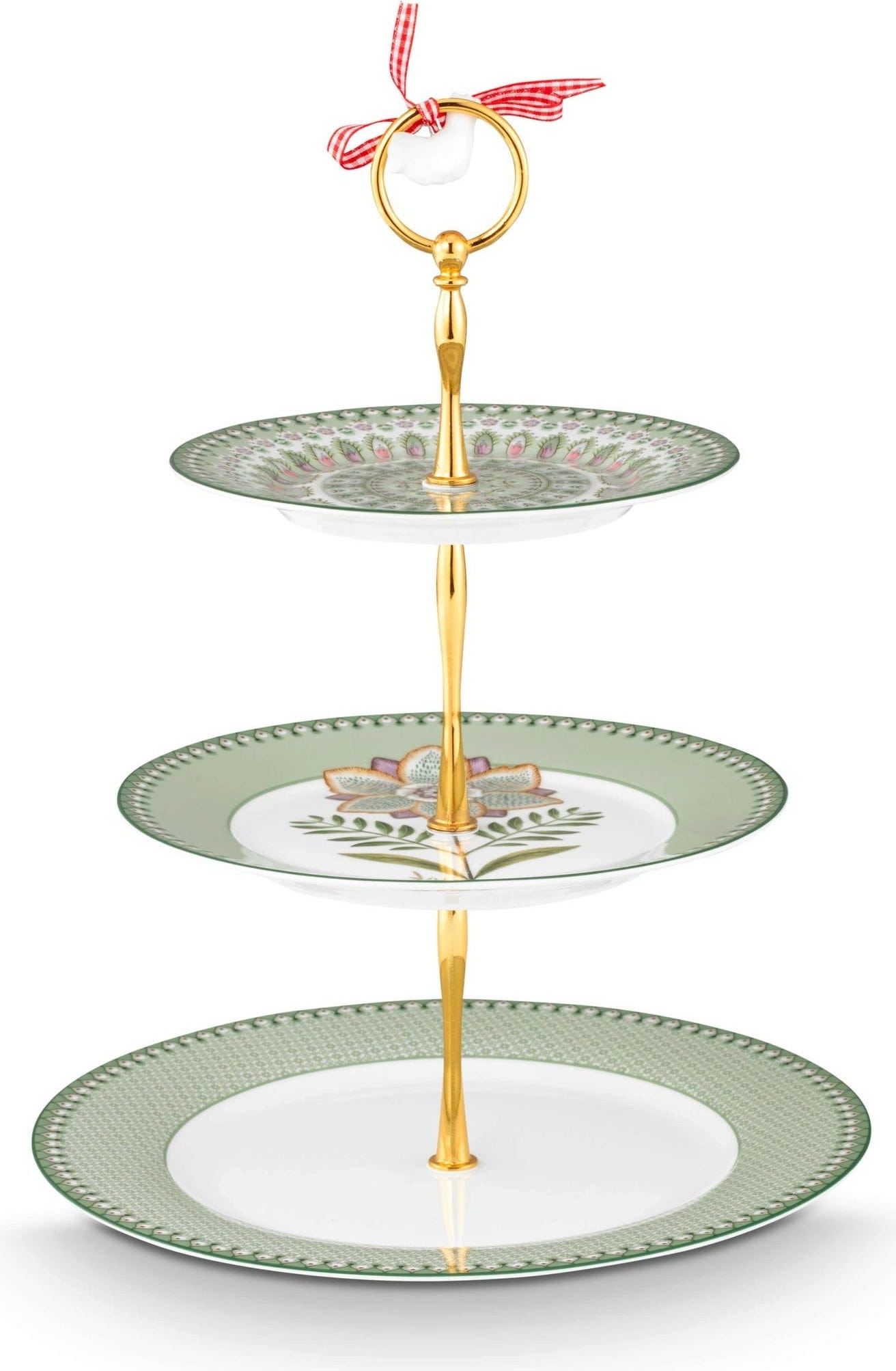 Contenido: bandeja de tres niveles compuesta por platos de porcelana de distintos tamaños