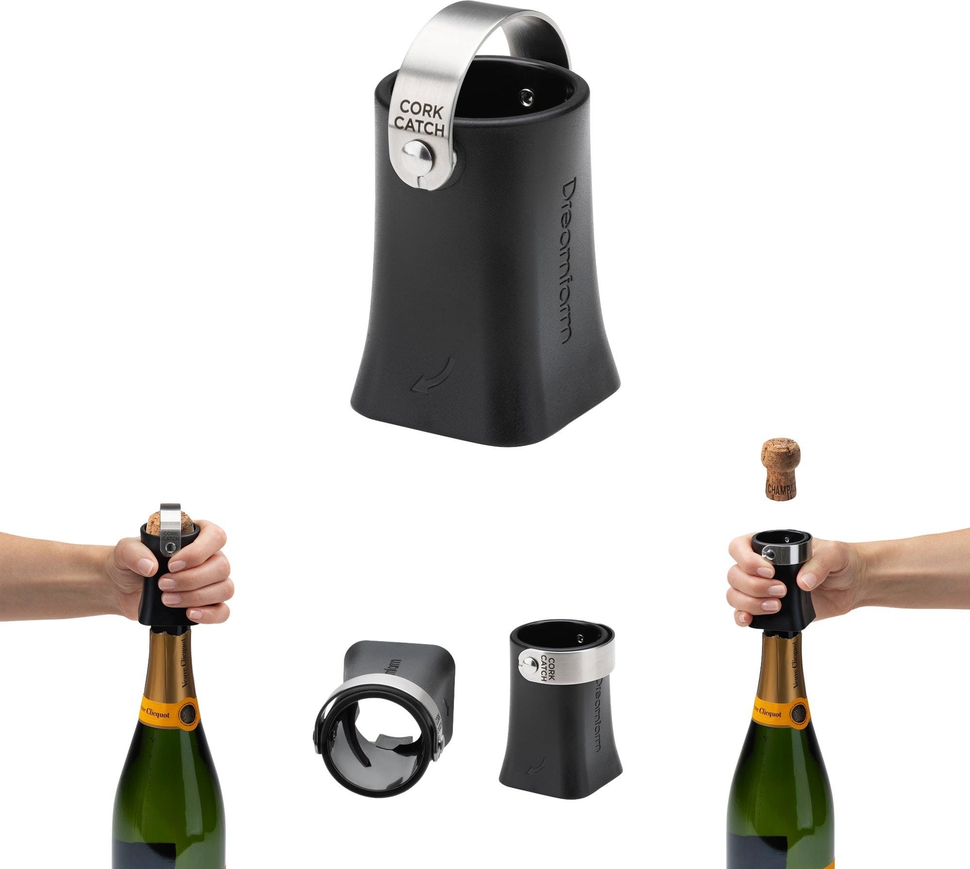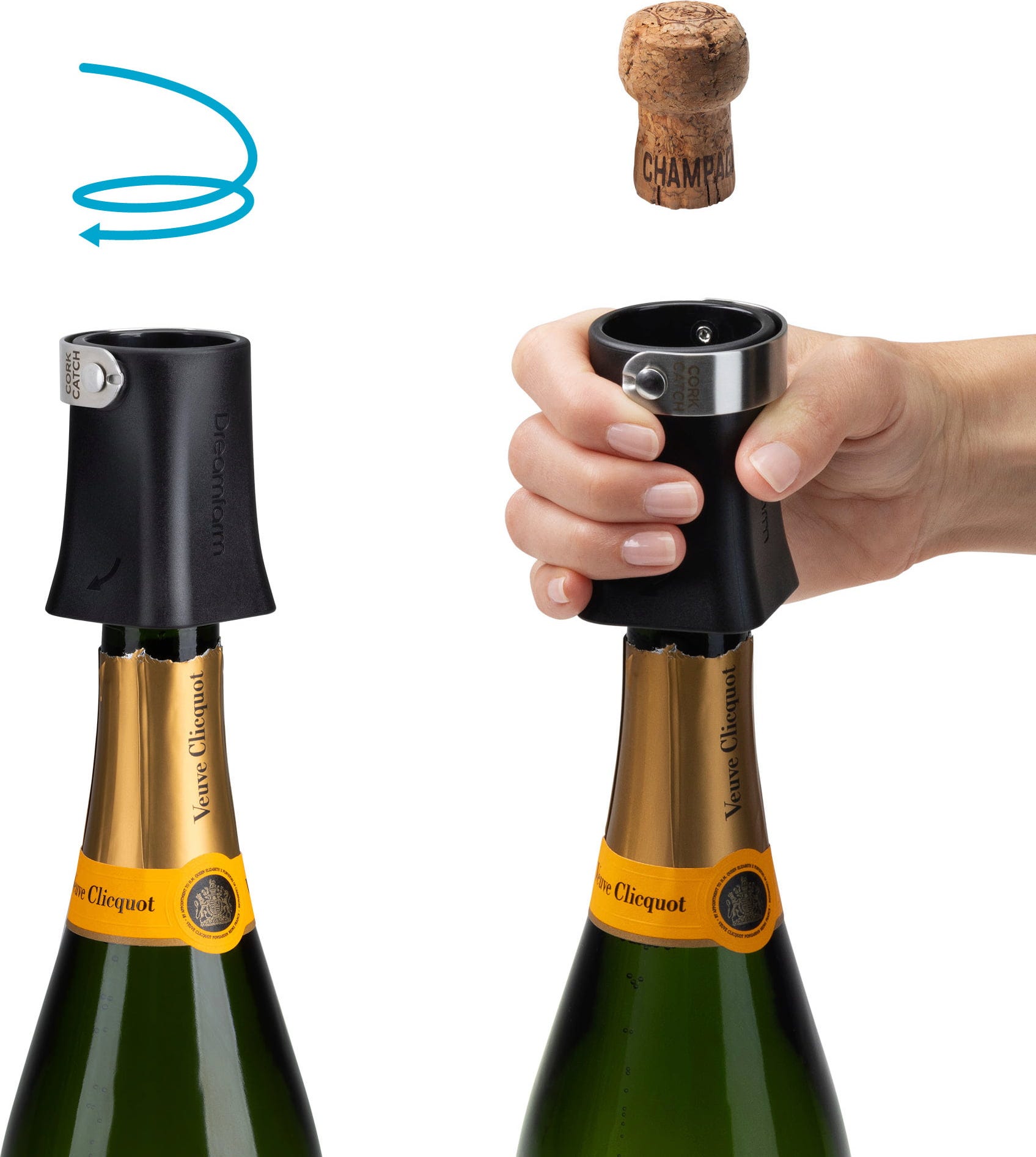 Con Champop de Dreamfarm, ya no tendrás que preocuparte por los tapones que salen disparados de forma descontrolada o por las bebidas que se derraman al abrir una botella de champán. Este ingenioso accesorio se coloca simplemente en el cuello de la botella y se gira ligeramente para liberar el tapón de forma controlada. Gracias a las ranuras de ventilación integradas, la presión se libera suavemente y se reduce la velocidad del corcho, de modo que queda recogido de forma segura dentro del dispositivo: este es el modo Lock.