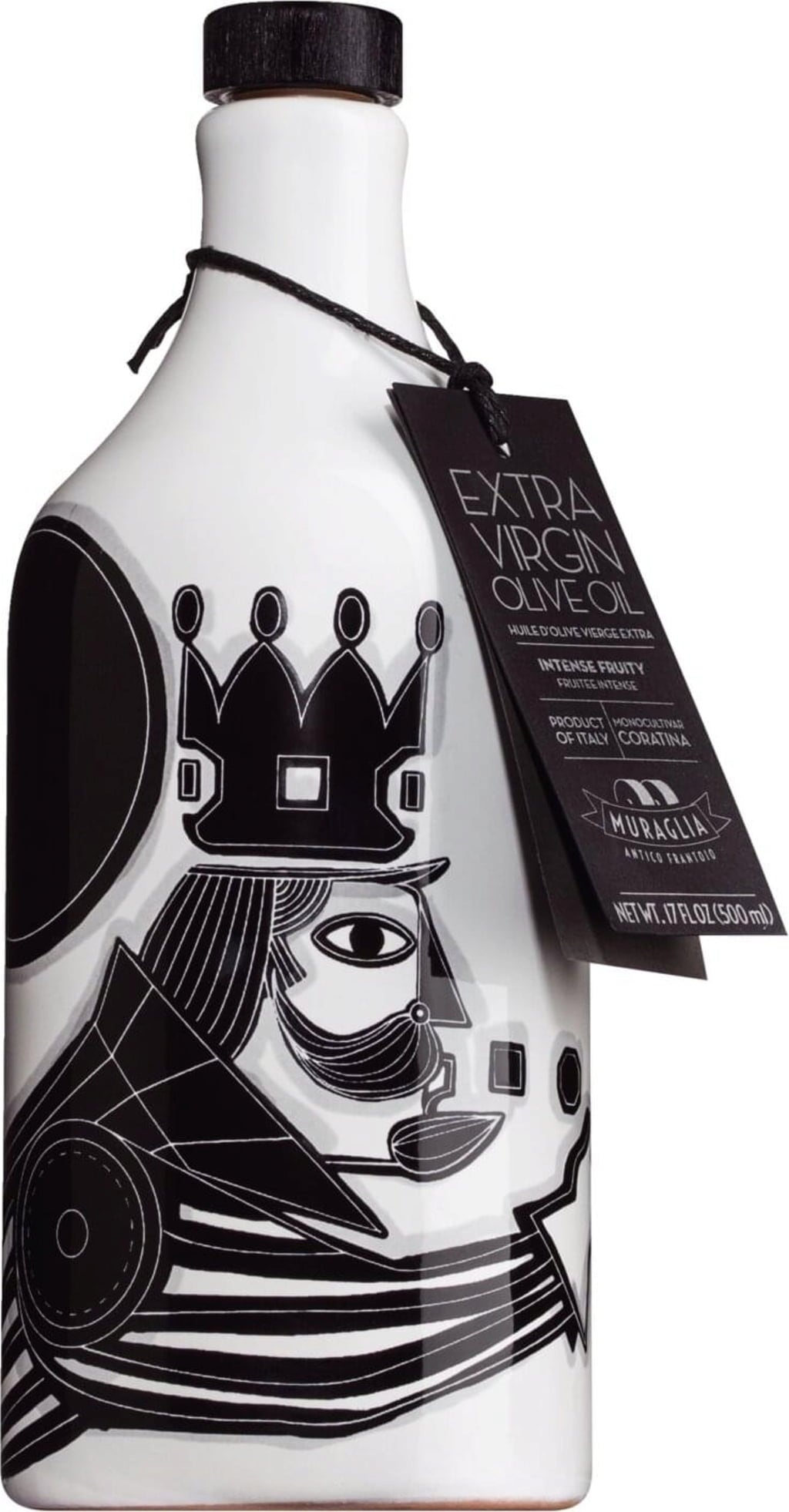 Este aceite afrutado e intenso es producido por Muraglia con aceitunas de la variedad Coratina de Apulia, cosechadas a mano y delicadamente prensadas en frío en un molino de piedra. Posteriormente, el aceite se vierte en botellas de barro hechas a mano. El dibujo del rey en la botella es obra del joven diseñador Pierpaolo Gaballo.