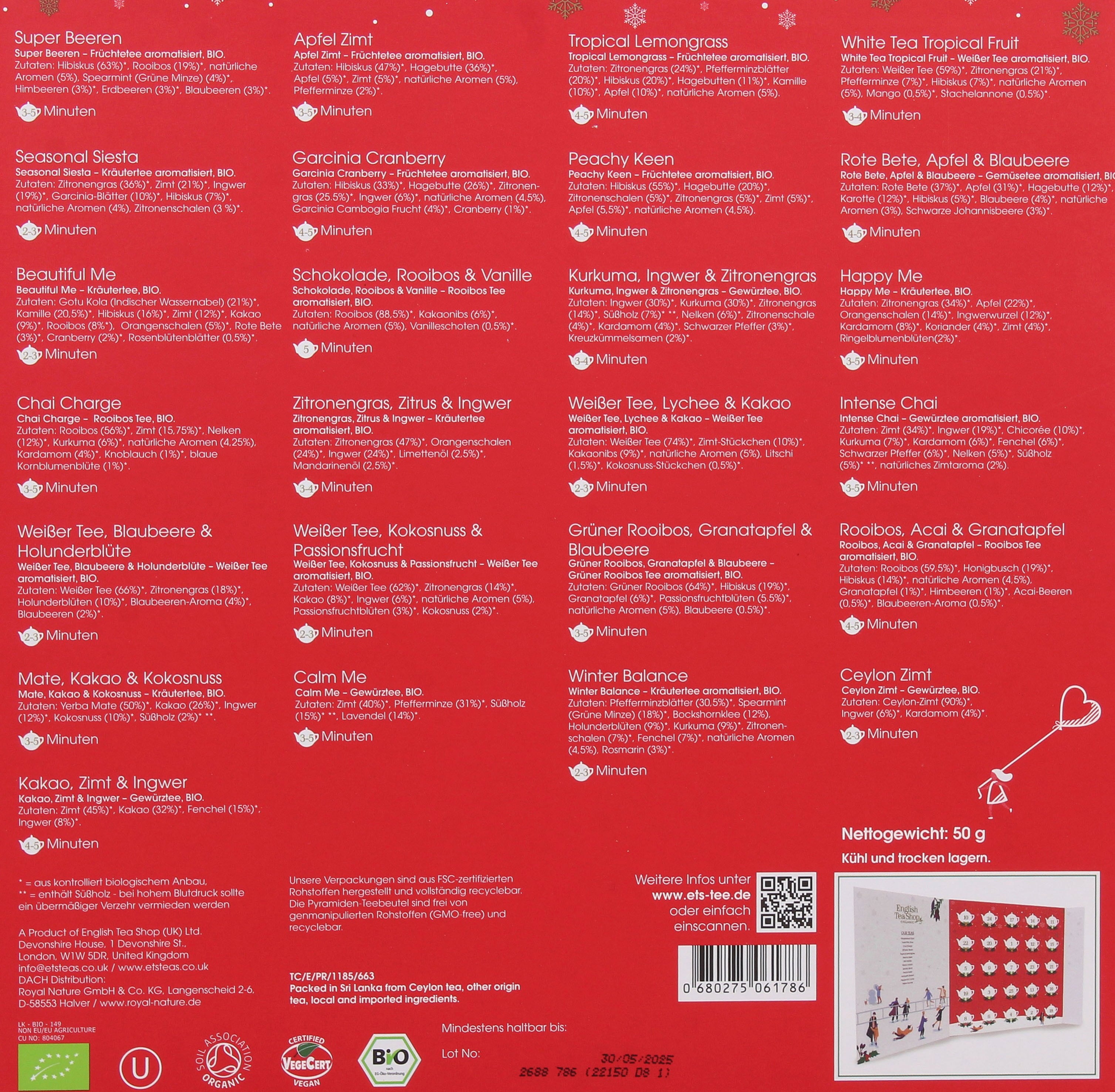 Una selección de 24 tés e infusiones más una sorpresa especial contenida en un calendario de Adviento único, que hará que la época prenavideña sea inolvidable. Detrás de cada puertecita hay una fina mezcla de té o infusión de hierbas biológicas de calidad, envasada en una bolsita con forma de pirámide.