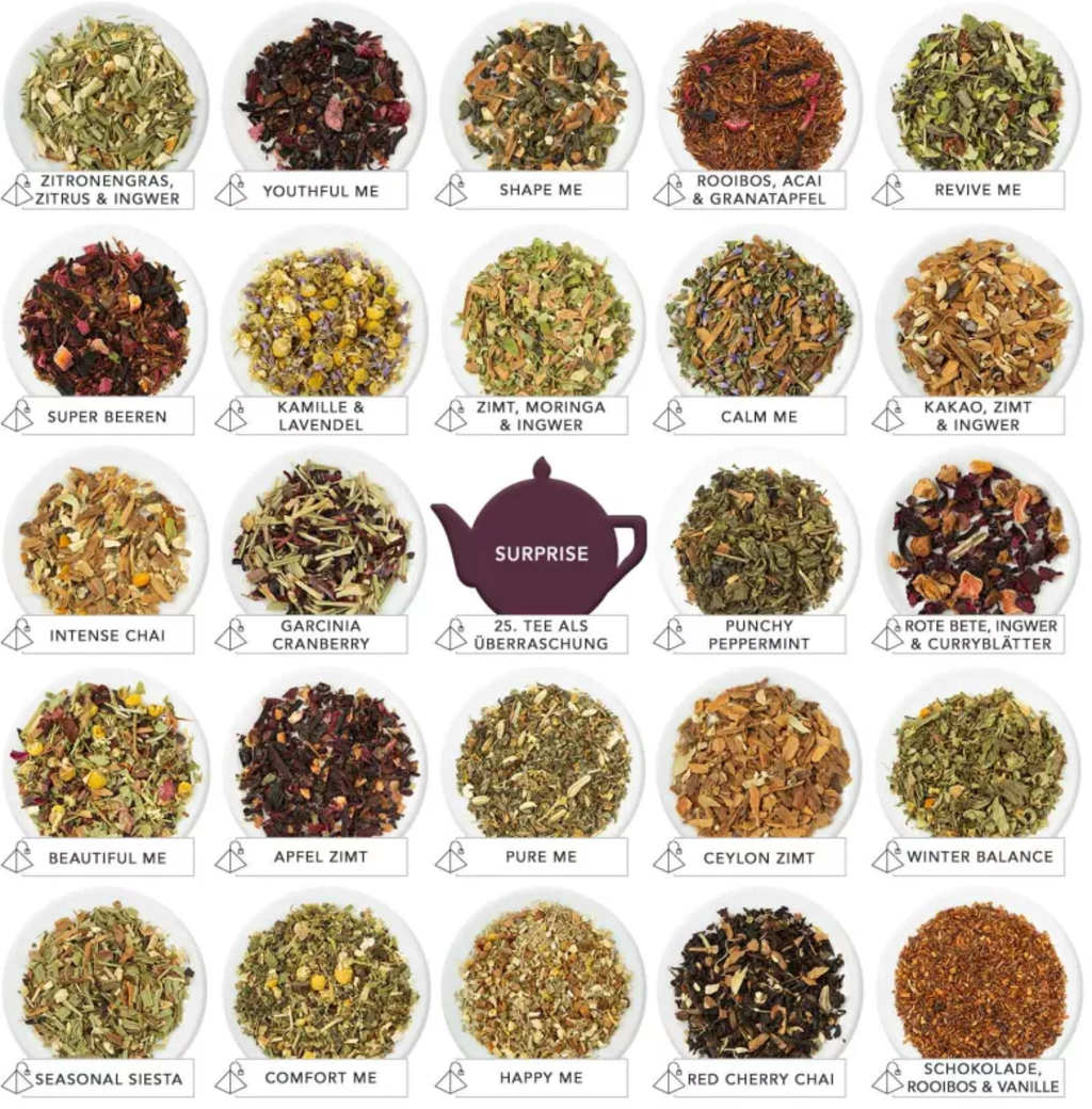 El gran calendario de Adviento en forma de libro de infusiones “Wellness” no sólo tiene 24, sino 25 puertecitas. Cada día, una nueva mezcla garantiza un disfrute variado de las infusiones durante el Adviento. Cada variedad, ya sea té verde, negro, de hierbas o de frutas, es maravillosamente aromática y de la mejor calidad biológica.
