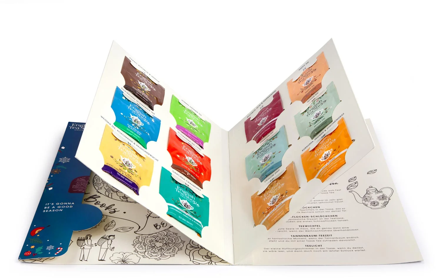 Lo especial de este calendario de Adviento es su forma, que se puede hojear como un libro y contiene 24 tés ecológicos y otros extras en varias páginas. Las mezclas de té incluyen tés especiales de invierno y Navidad que difunden un ambiente prenavideño y animan a detenerse y saborear.