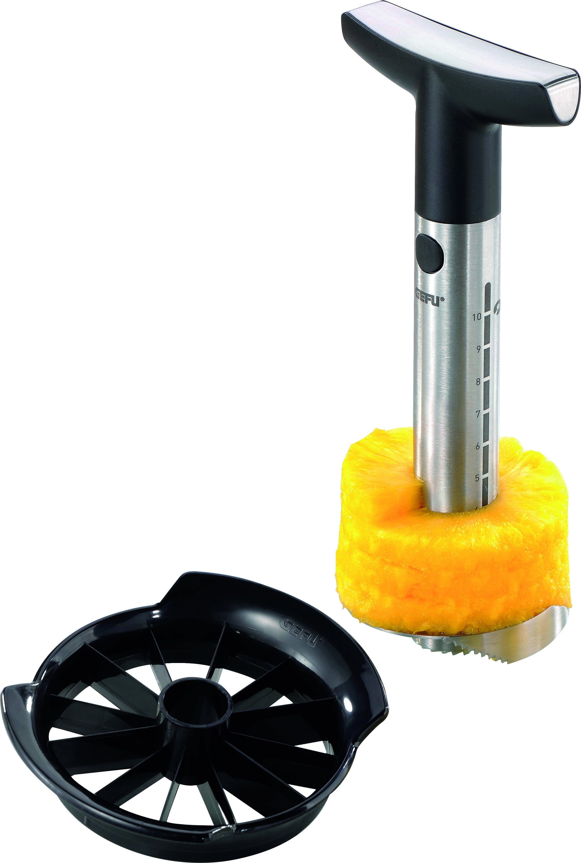 ¿Te encanta el sabor dulce y jugoso de la piña fresca, pero quieres evitar el laborioso proceso de pelarla? La cortadora de piña PROFESSIONAL te lo pone fácil. Te permite obtener anillos perfectamente pelados y sin corazón. Gracias al mango ergonómico, aplicas la fuerza de rotación justa para deslizar sin esfuerzo la afilada cuchilla de acero inoxidable a través de la pulpa.