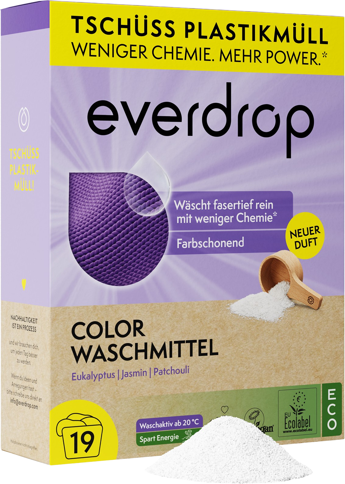 Embalado en una caja de papel completamente sin plástico, este detergente presenta una composición biodegradable, sin microplásticos y sin ingredientes animales. Con la ayuda de tensioactivos vegetales, el detergente cuida tus prendas de color, mientras que las fragancias naturales aportan un delicado aroma a eucalipto, jazmín y pachuli. Dado que desarrolla todo su poder de lavado a partir de una temperatura de lavado de 20 °C y requiere hasta un 40 % menos de dosis que otros detergentes ecológicos, ¡este detergente permite lavar la ropa de forma más sostenible!
