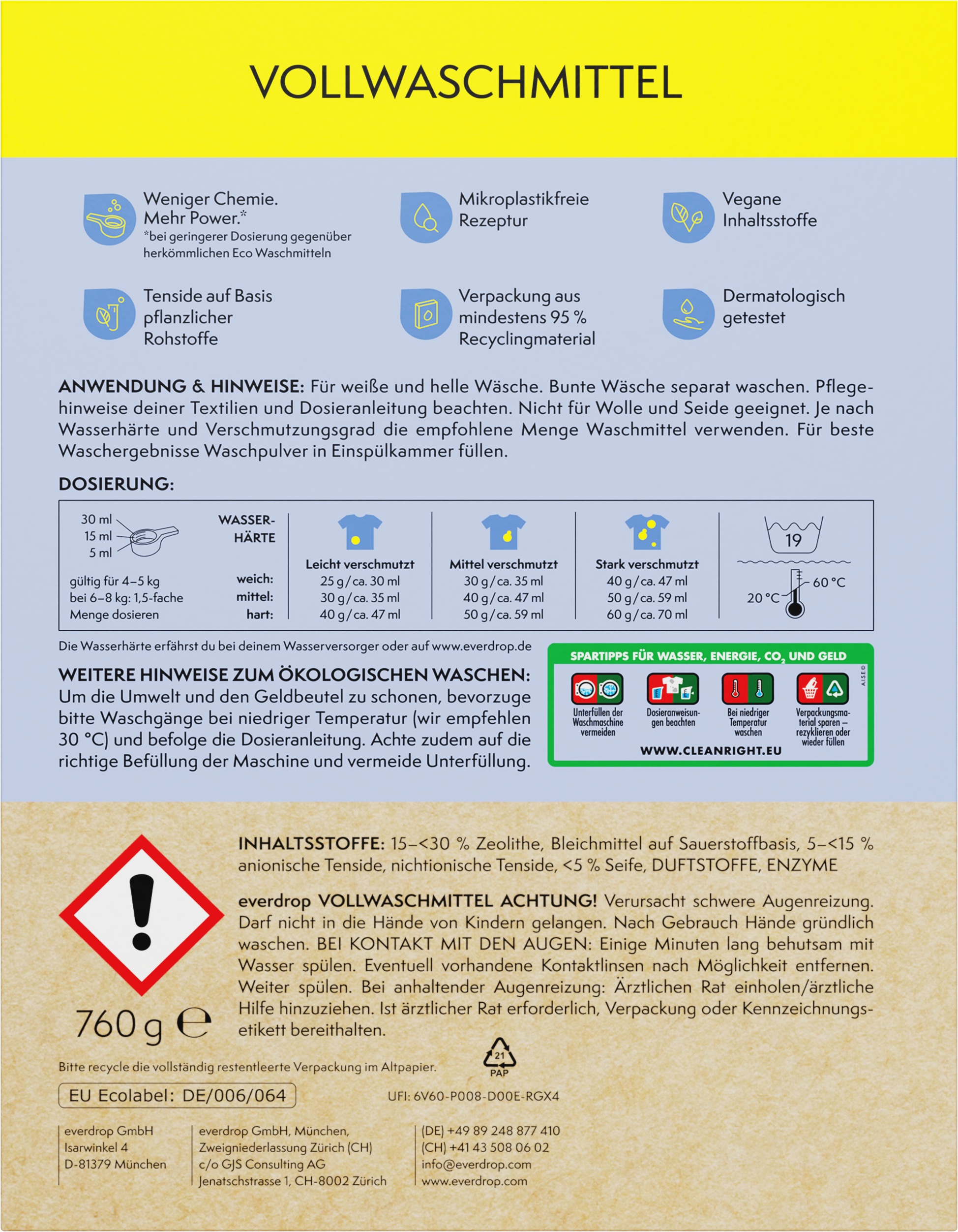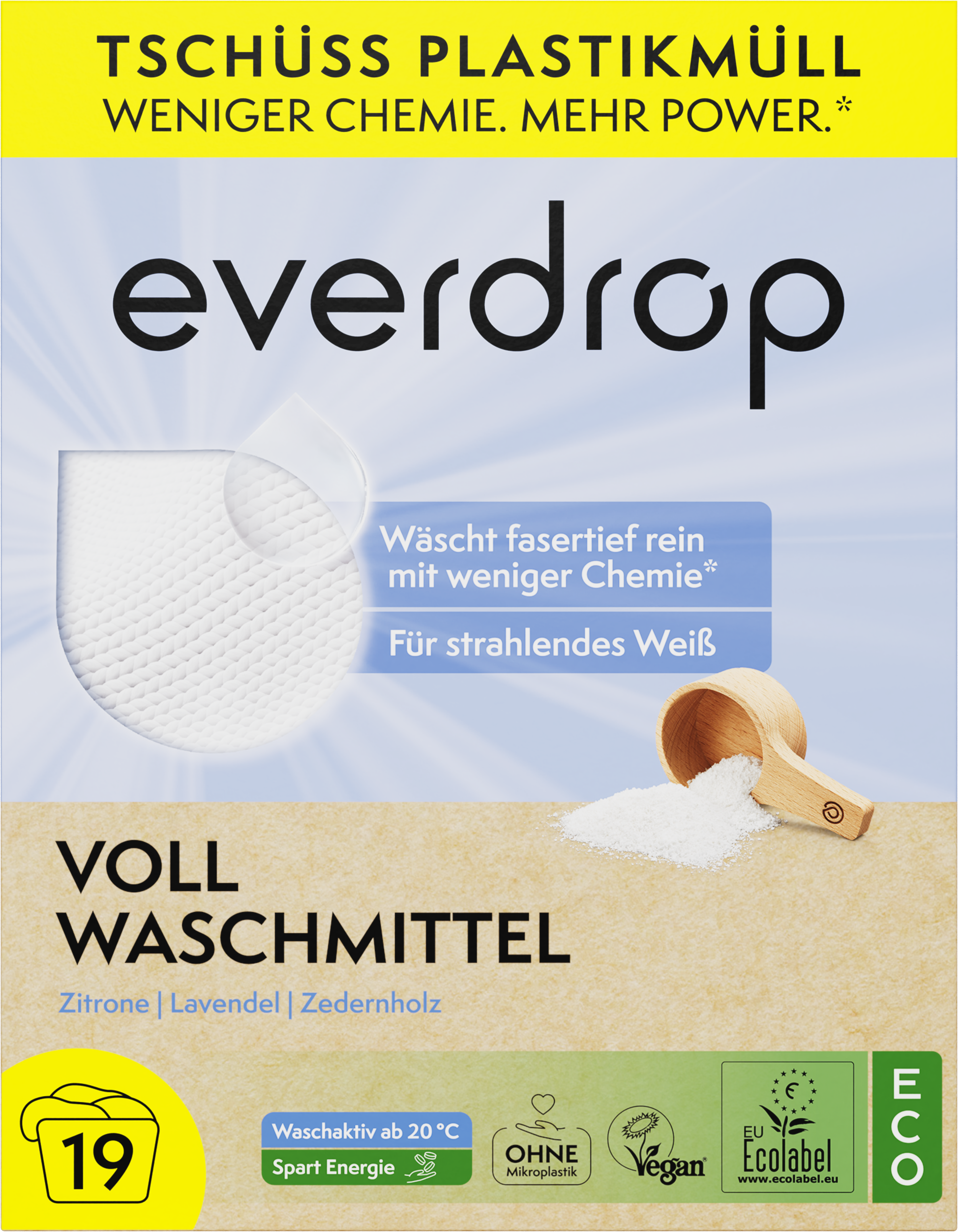 Con una dosificación hasta un 40% inferior a los detergentes ecológicos tradicionales, este detergente contiene tensioactivos a base de materias primas vegetales que eliminan la suciedad de la ropa clara y blanca, a partir de los 20 °C, Con agradables notas de limón, madera de cedro y lavanda, el detergente no contiene ingredientes de origen animal ni microplásticos y además es extremadamente respetuoso con la piel y biodegradable. Los envases de papel están fabricados con al menos un 95 % de materiales reciclados y se pueden desechar en el contenedor para papel.